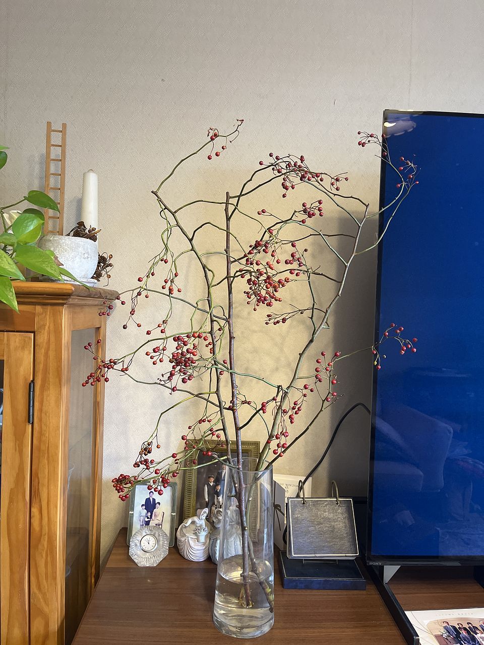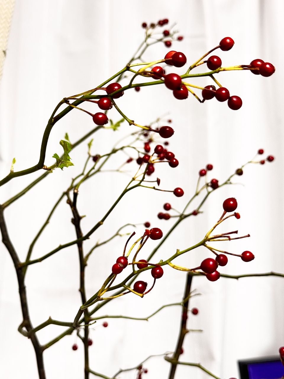 ツヤツヤした赤い実がたくさんついていて、秋冬らしさを感じられます♪以前購入したシリンダーベースによく合います。