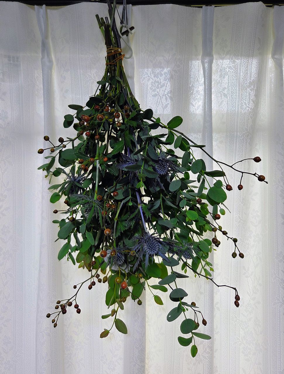 エリンジウムや針葉樹のブルーアイス、野バラの実を組み合わせて。ドライに向いてるお花をセレクトしています。