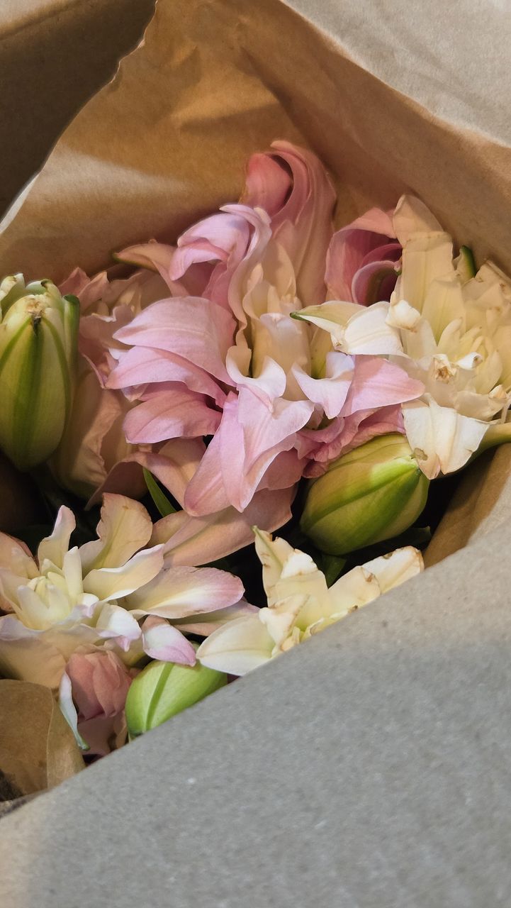 このお花が好きで3度目の購入です 前回より大きめのお花でした 今日は気温が上がっているので 到着1時間でこのような感じです よい香りに癒されています🫶