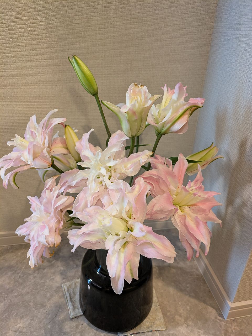 いつもたくさんのお花を紹介していただき、ありがとうございます。 こちらのユリは、前回購入した時にあまりにも素敵だったので、いろいろなお花に挑戦したいと思いつつも再度購入しました。 もう本当に本当に素敵なユリです。 1本に蕾がたくさんついていて、八重咲きになるとピンクから白へのグラデーションが本当に美しくて華やかで、ずっと見ていられます。 部屋中にふんわりと良い香りが漂って、とても癒されています。 大切にお世話をして、できるだけ長く咲き誇っていてほしいと思います。