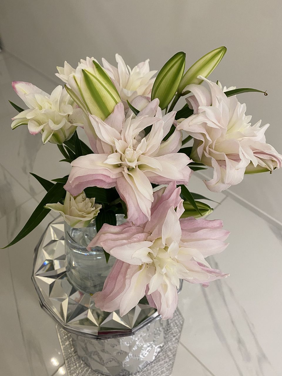 気になっていたもののイメージがわかず躊躇していましたが、大当たりでした! 八重咲きってとってもエレガント!百合の香りもほんのりして癒されます。本数が少なめかなーと思いましたが蕾が沢山付いていてボリューム満点です! 長持ちするようお世話を頑張ります💪