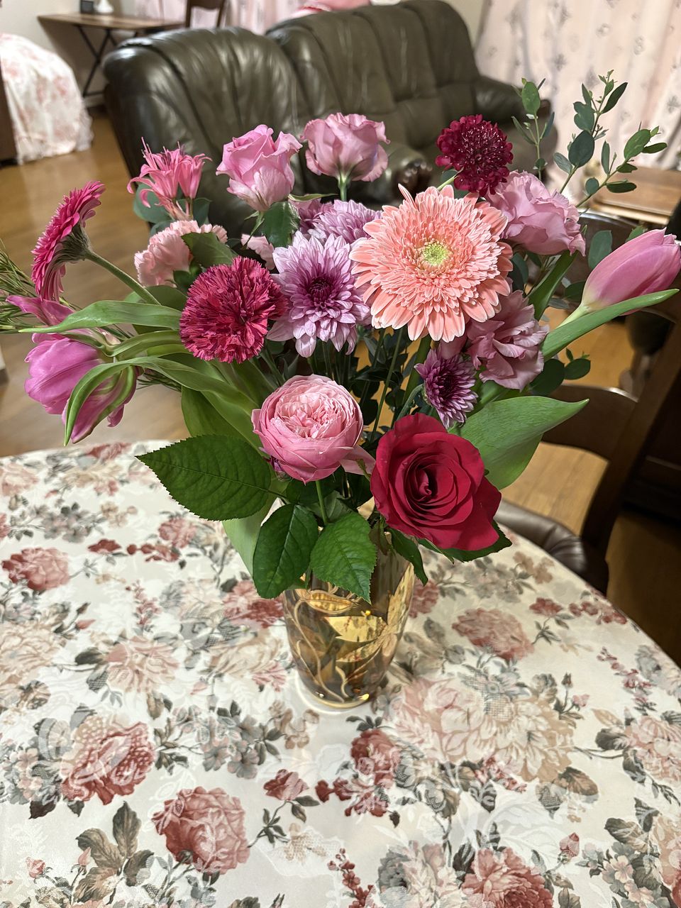 手前のカーネーションは前回注文ものがまだまだ元気だったので一緒にしましたかわちぃ 濃いめピンクが素敵です 義母は猫ミームみたく喜んでました