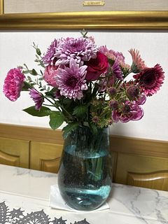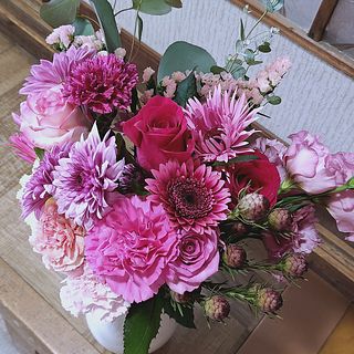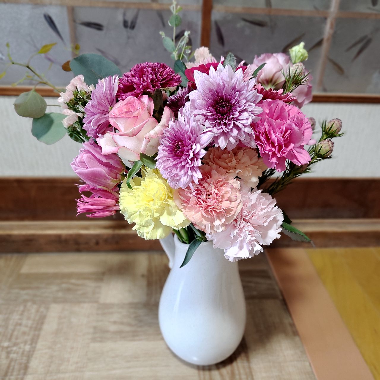 2束をまとめて飾りました。 様々な種類のお花が入っていてとても楽しいです。 お花もたいそうみずみずしくて新鮮です。 心がワクワク嬉しくなってしまうブーケです。 リピートしたいと存じます。 ありがとうございました。