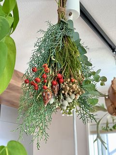 届いて開けた途端、とても爽やかな香りが広がりました。2、3日飾ってと思いましたが、スワッグにするには直ぐに風通し良いところで…と言う事だったので、そうしました。今から出来上がりが楽しみです。