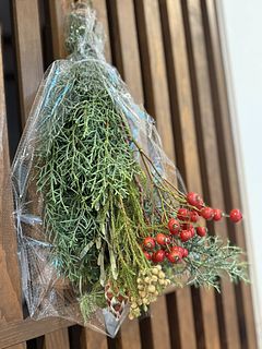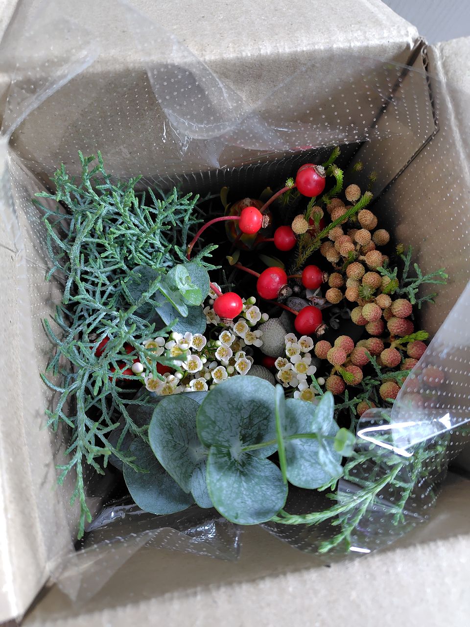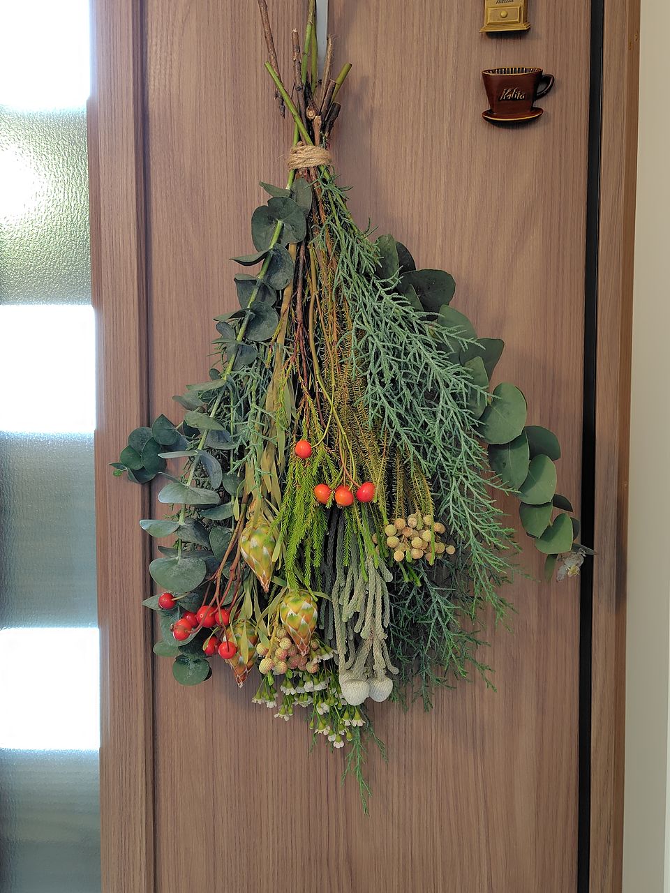 箱を開けた途端グリーンの爽やかな香り、枝ぶり、組み合わせ彩り、全て期待通りでした。 家にあったユーカリの枝を少し加えてスワッグにして玄関に飾ってます♪ 12月になったらクリスマスぽい物を加えて(リボンとか🔔とか)楽しみたいと思います🎄