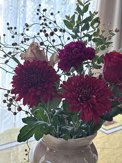 マム初めて購入。花弁が開いて手毬の様で可愛らしいです。全体の色合いも落ち着いた赤系で派手にならず良き。