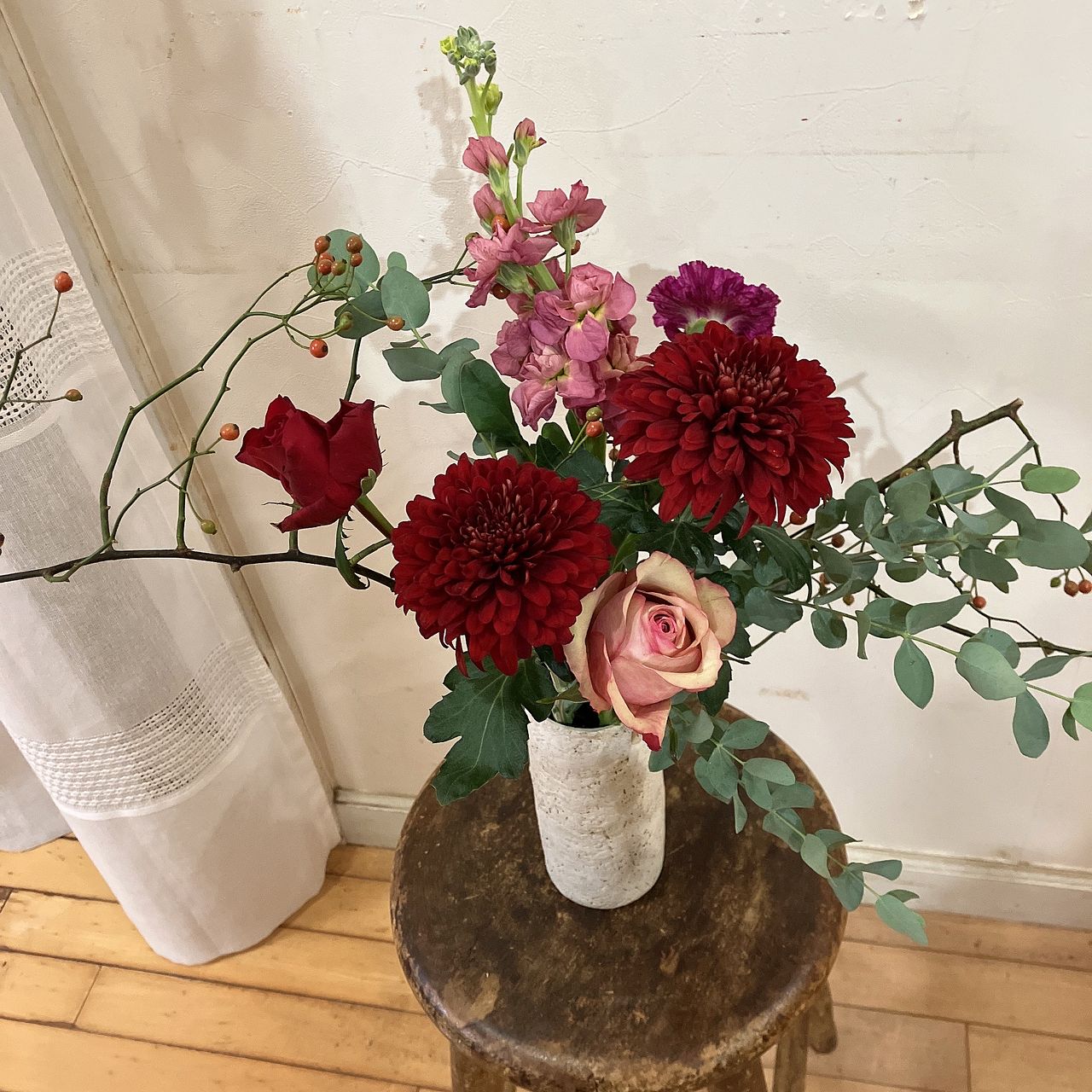 冬の赤の花束、とっても素敵でした。バラの実は形に動きがあって可愛いですね!真っ赤なバラも落ち着いた華やかさがあって嬉しい花束でした。