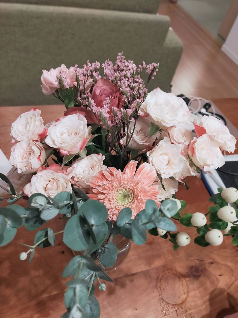 今回はてんびん座のシンボルカラー、ピンクを束ねて♎️淡いピンクのバラや、もこもこガーベラをセレクトしました。