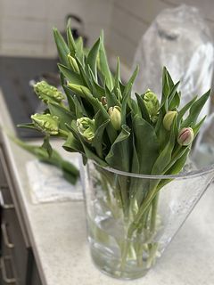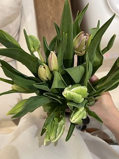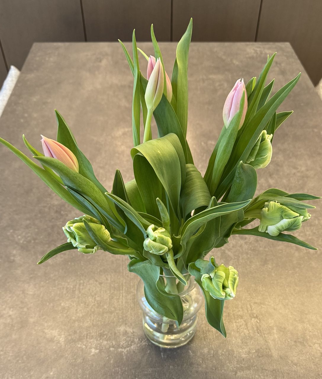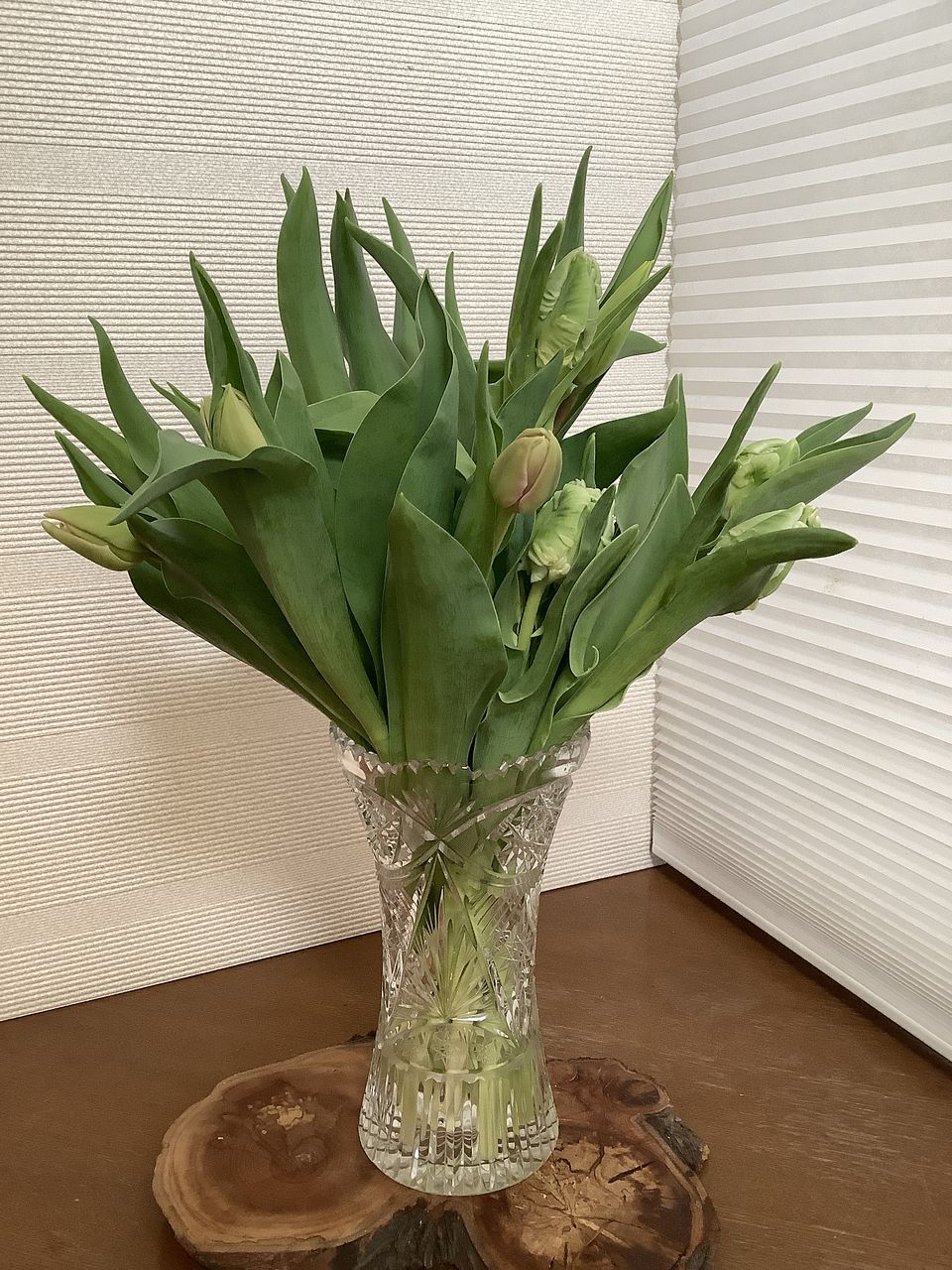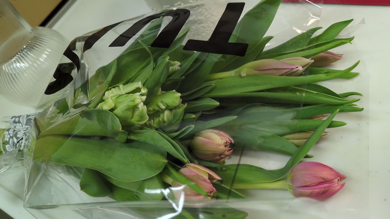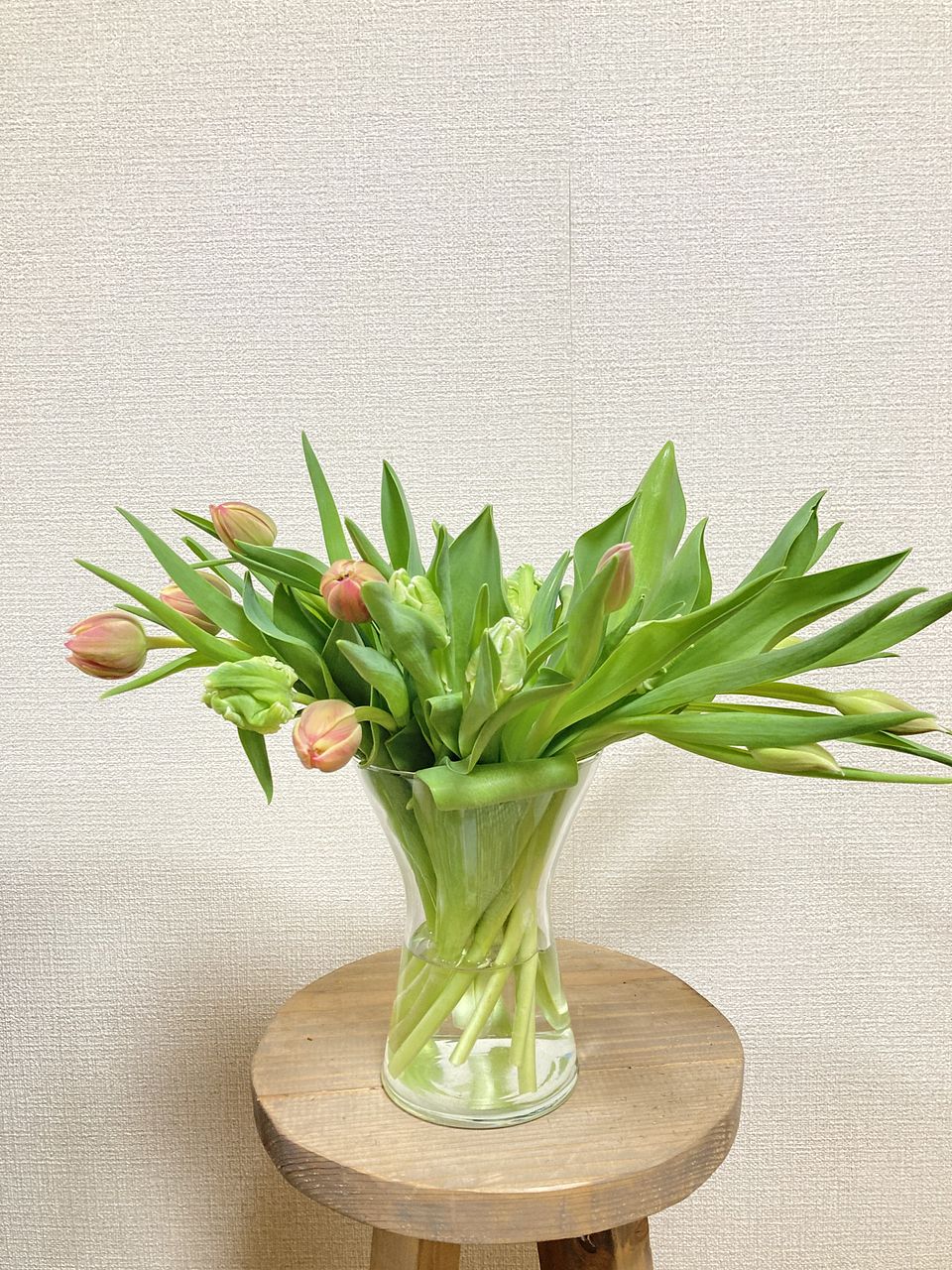 毎年の楽しみです😍シャッキシャキの新鮮なチューリップが届いて、毎日だんだんと色づいていく変化が楽しめるのはこの花屋だけ。 色づく前のチューリップなんて、なかなか普段見れません!