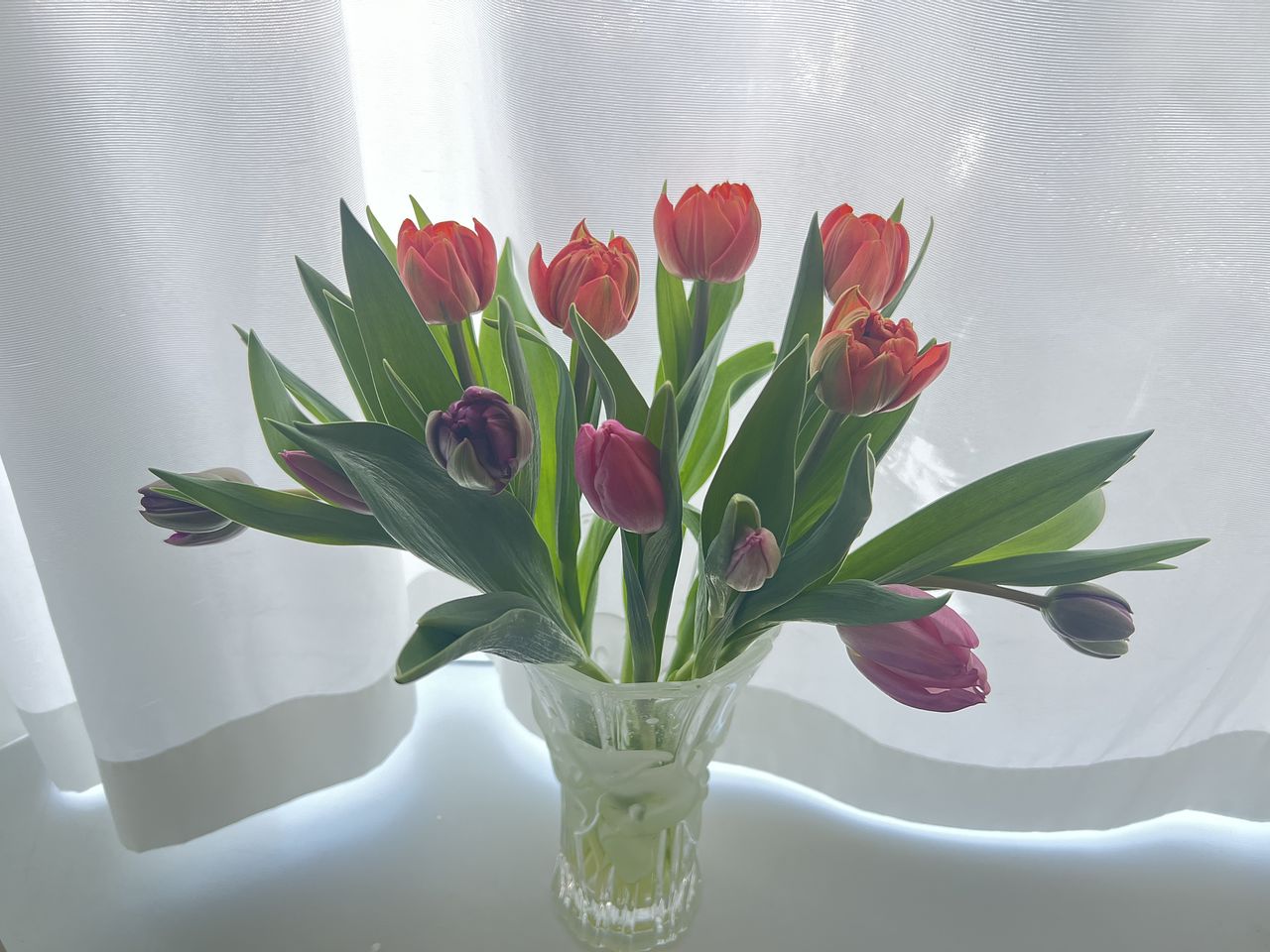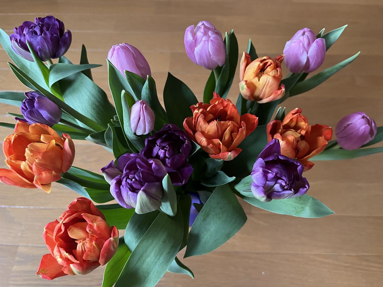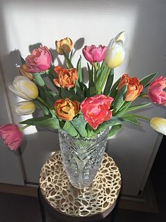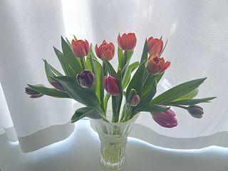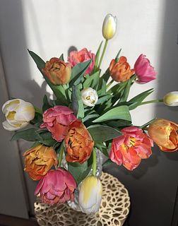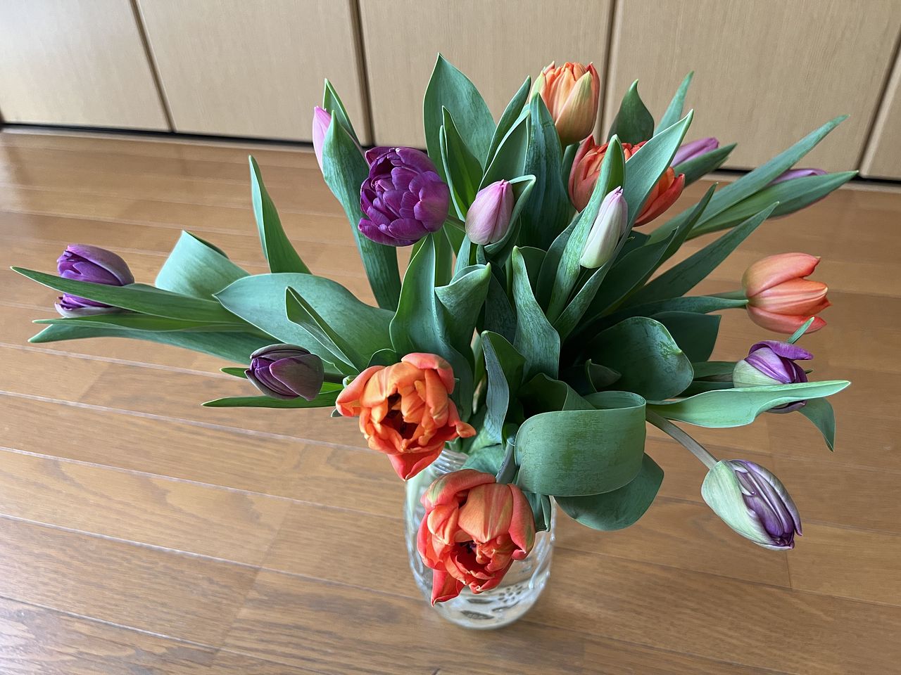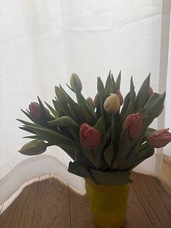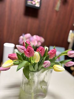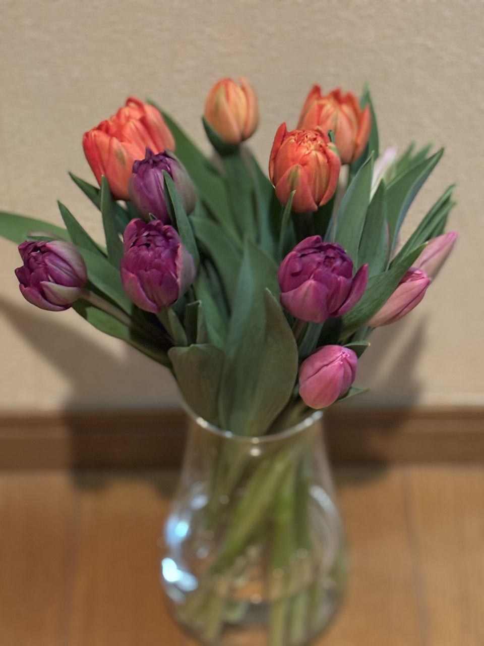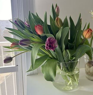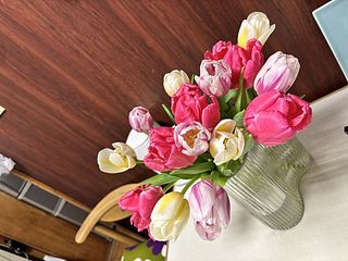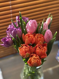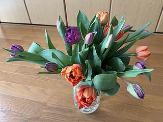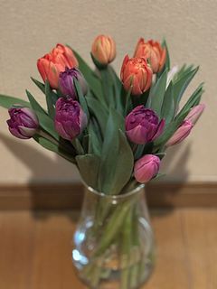 水揚げ中から花開いて色づいてきてワクワクでした!しっかり水を吸ってくれたので花瓶にもたれるようなしなやかさはなく(笑)チューリップ畑のようになりました。紫系が入ったらいいなと と期待していましたが、ピンクオレンジ白の3色で結果的にバランスも良く気に入っています。