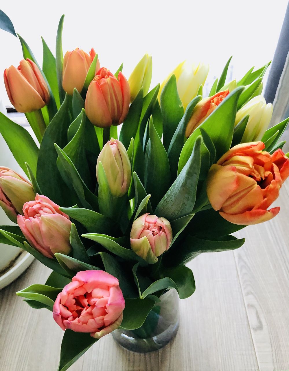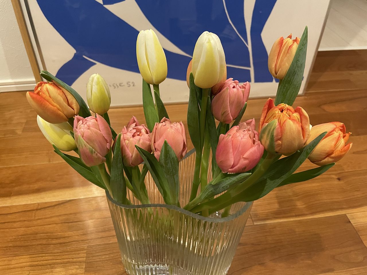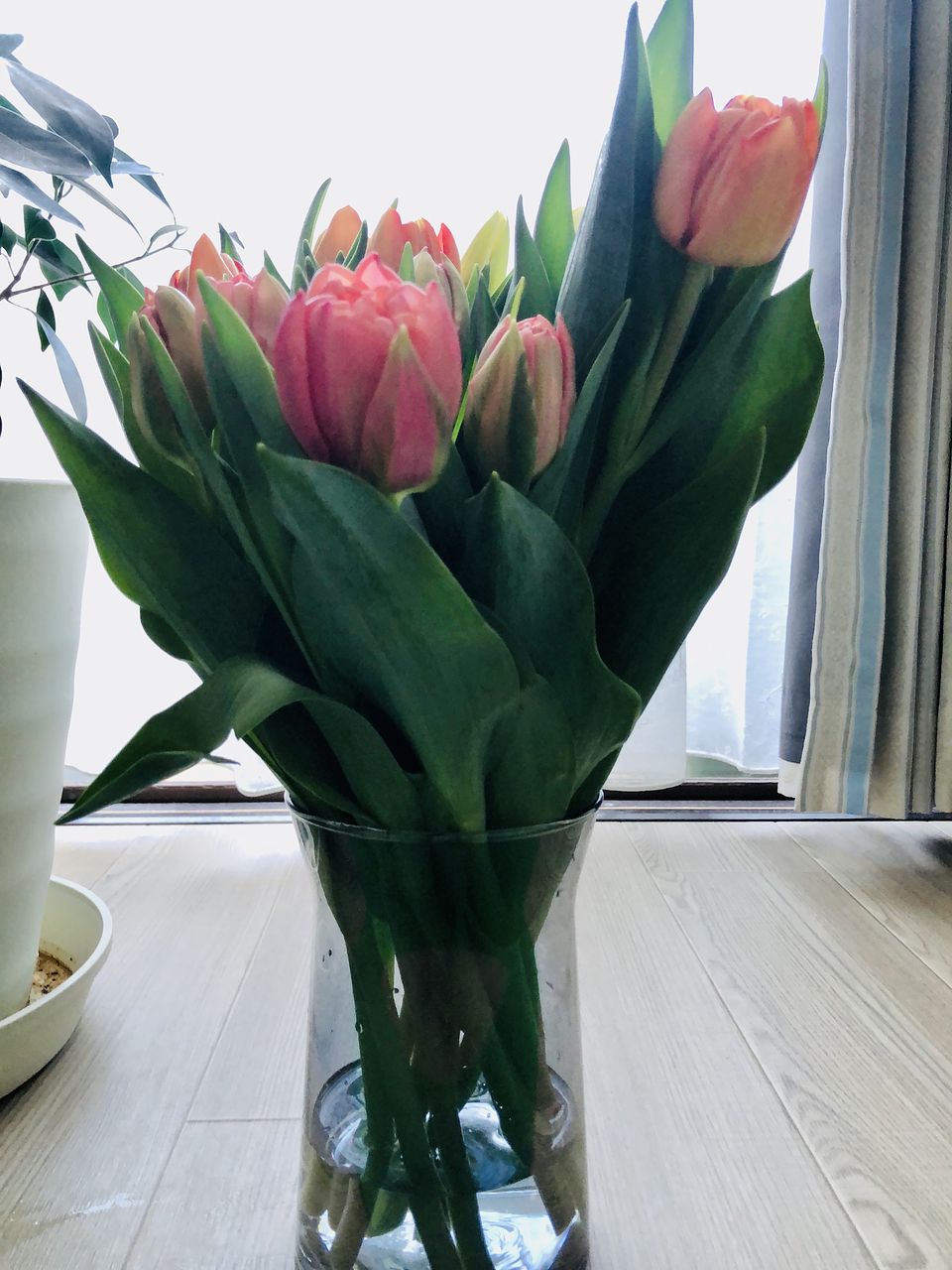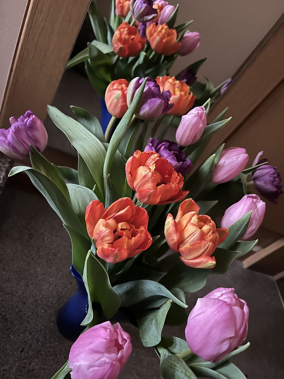 水揚げ中から花開いて色づいてきてワクワクでした!しっかり水を吸ってくれたので花瓶にもたれるようなしなやかさはなく(笑)チューリップ畑のようになりました。紫系が入ったらいいなと と期待していましたが、ピンクオレンジ白の3色で結果的にバランスも良く気に入っています。