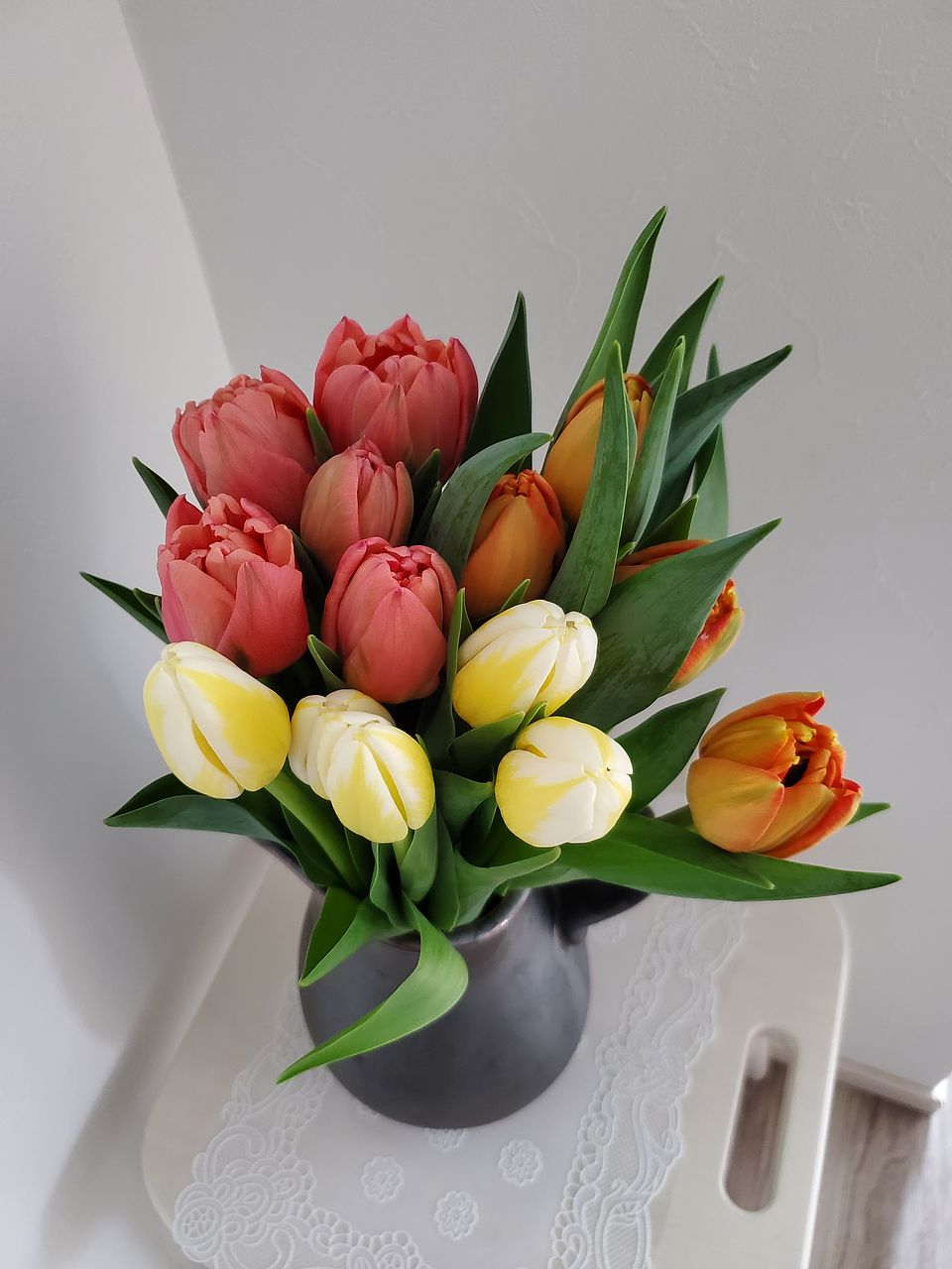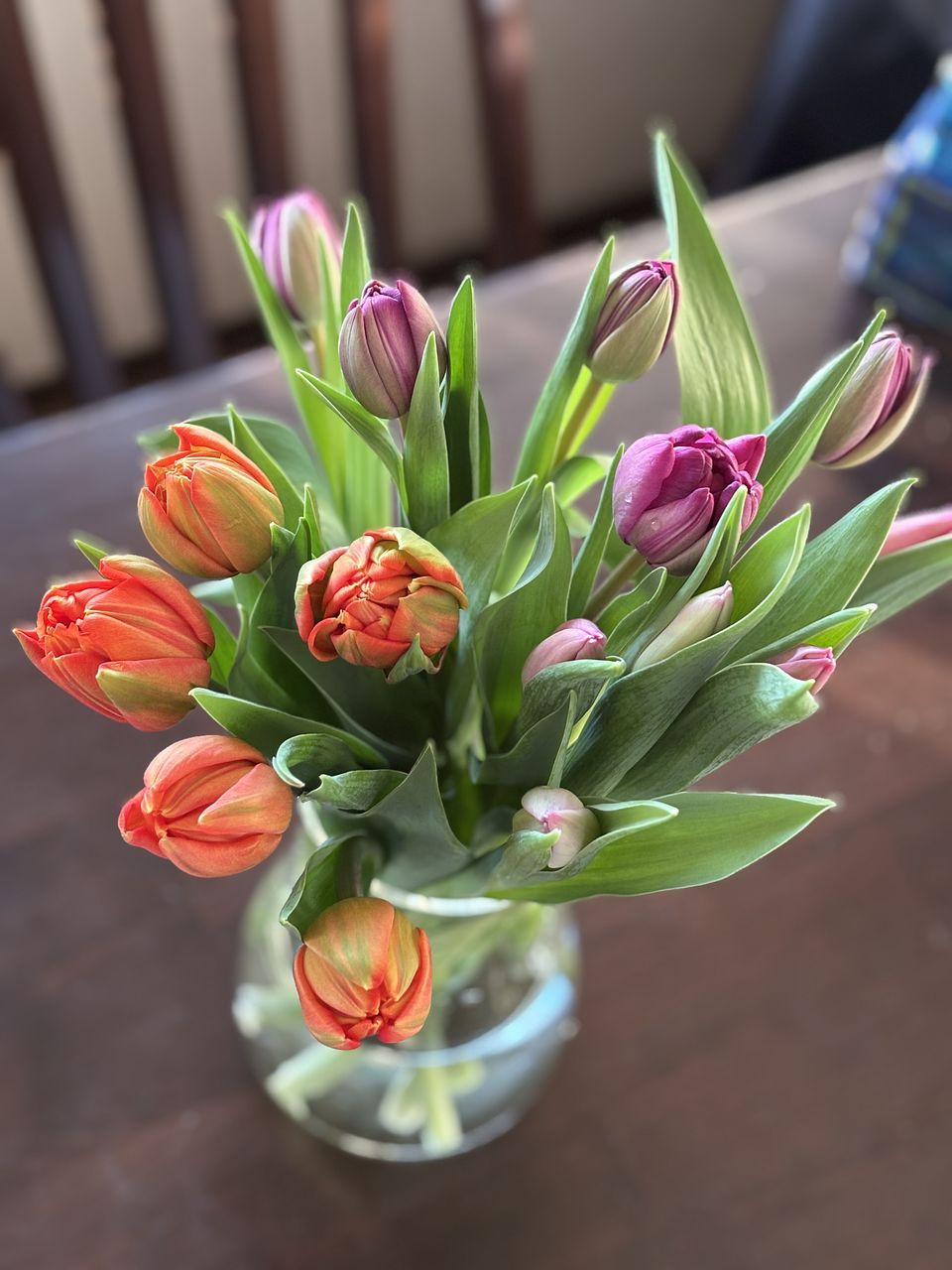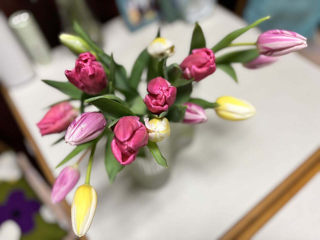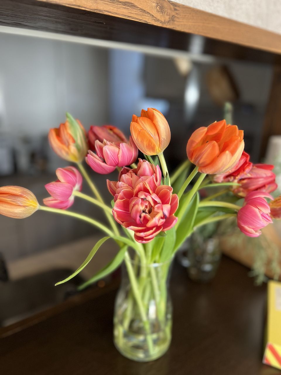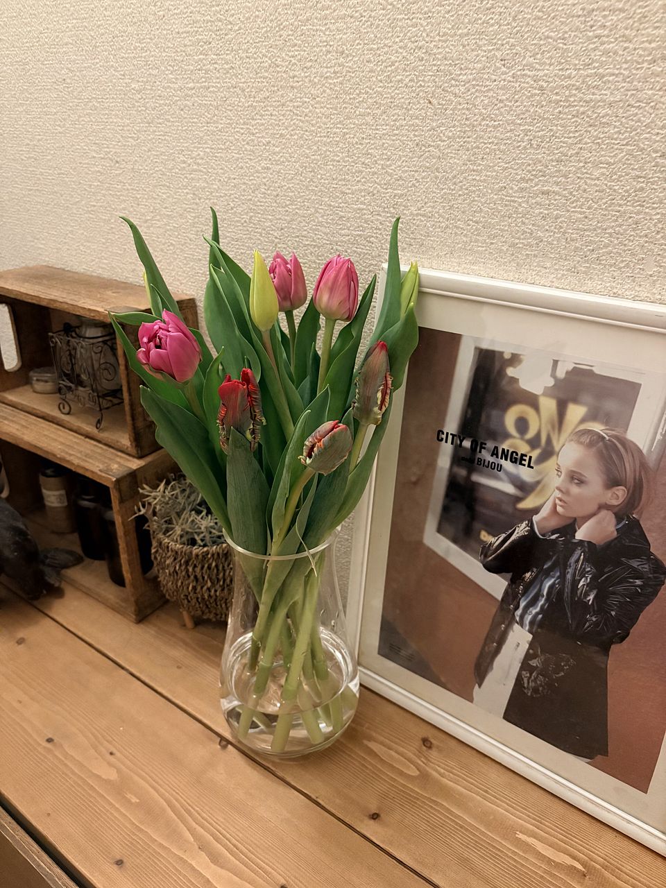 水揚げ中から花開いて色づいてきてワクワクでした!しっかり水を吸ってくれたので花瓶にもたれるようなしなやかさはなく(笑)チューリップ畑のようになりました。紫系が入ったらいいなと と期待していましたが、ピンクオレンジ白の3色で結果的にバランスも良く気に入っています。