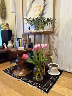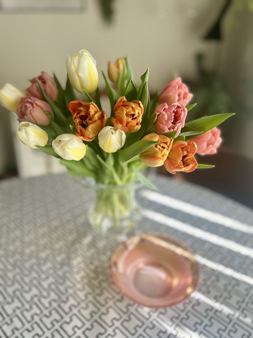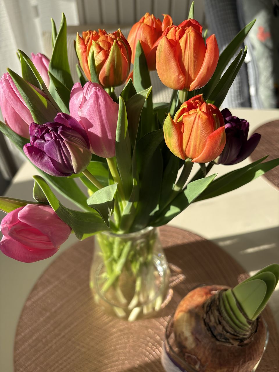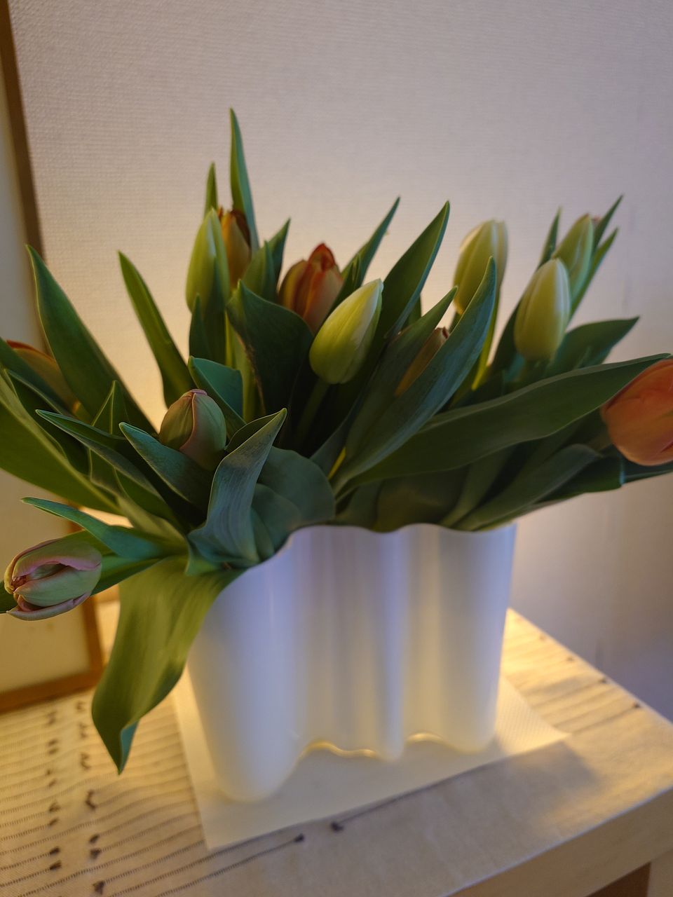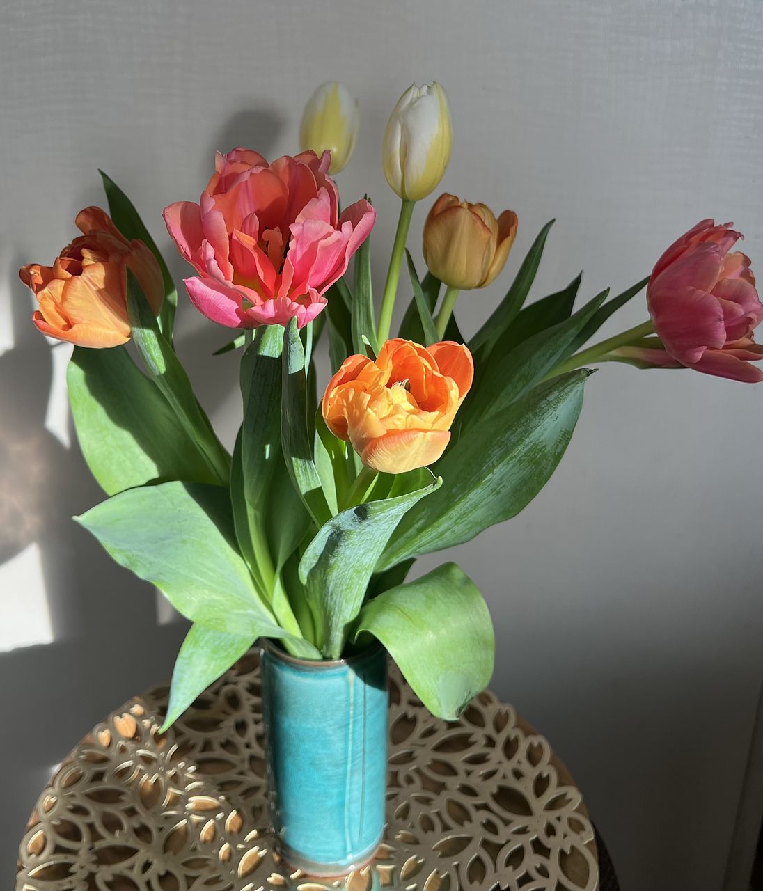 水揚げ中から花開いて色づいてきてワクワクでした!しっかり水を吸ってくれたので花瓶にもたれるようなしなやかさはなく(笑)チューリップ畑のようになりました。紫系が入ったらいいなと と期待していましたが、ピンクオレンジ白の3色で結果的にバランスも良く気に入っています。