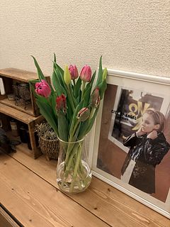チューリップ専用箱から、ボリュームいっぱいのお花が見えて、花束抱えて感激しました。 春がきた!と実感しました。 写真は水揚げ中のお花です。楽しみ、楽しみ。