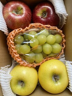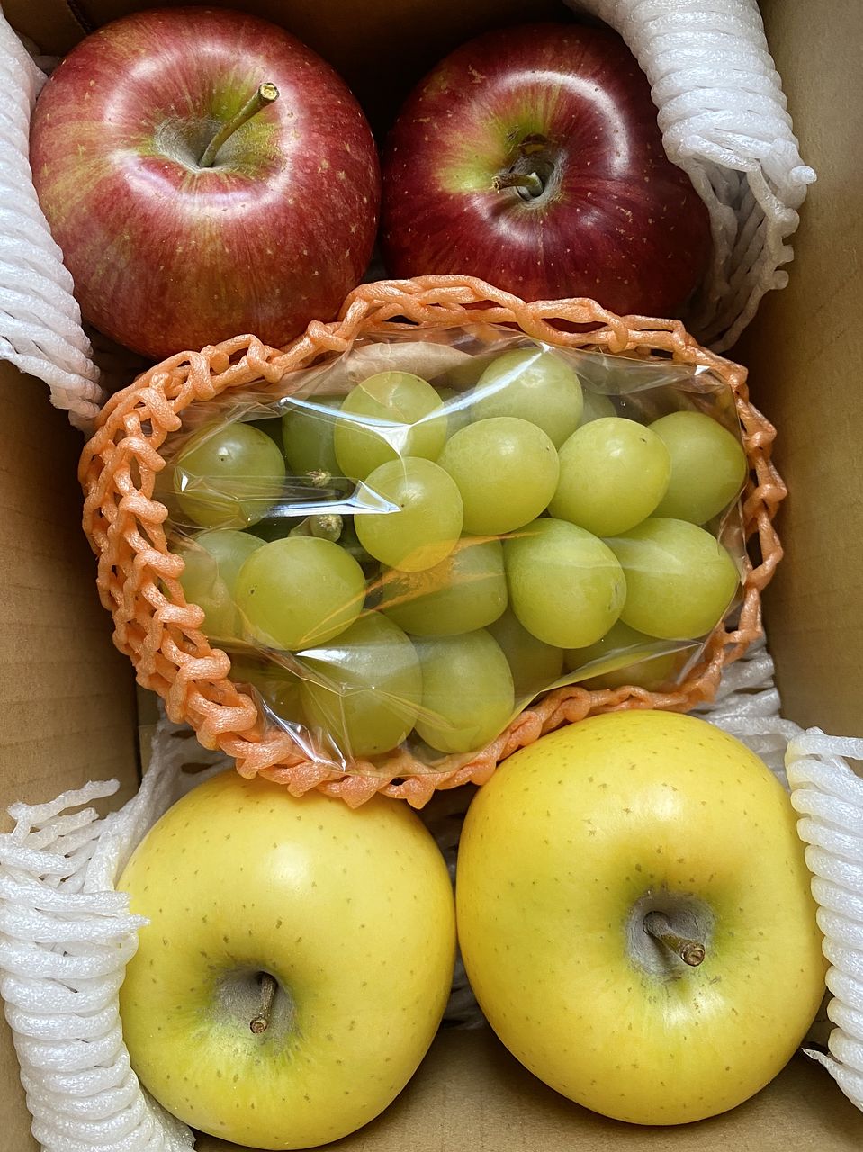 大粒のプルプルなシャインマスカット、りんごも見た目もキレイで味も美味しい! 長野県住みでわりと頻繁にりんごもシャインマスカットも食べますが、贈答用って感じでひと味も二味も違いました♪