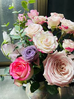 バラの品種はさまざま!イングリッシュローズをイメージしたふんわり優しいカラーのバラと季節の草花をたっぷり束ねてお届けします。