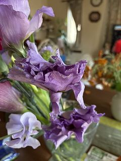 私の好きな色で、 気に入りましたが、トルコ桔梗が、2輪 押しつぶされた様な花有り、残念です。 自宅にあった、パープルのスターチスを少しプラスして 生けてみました。