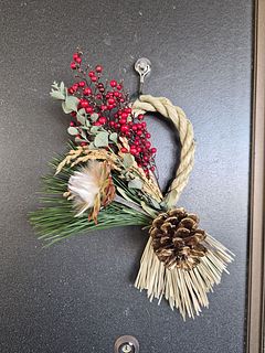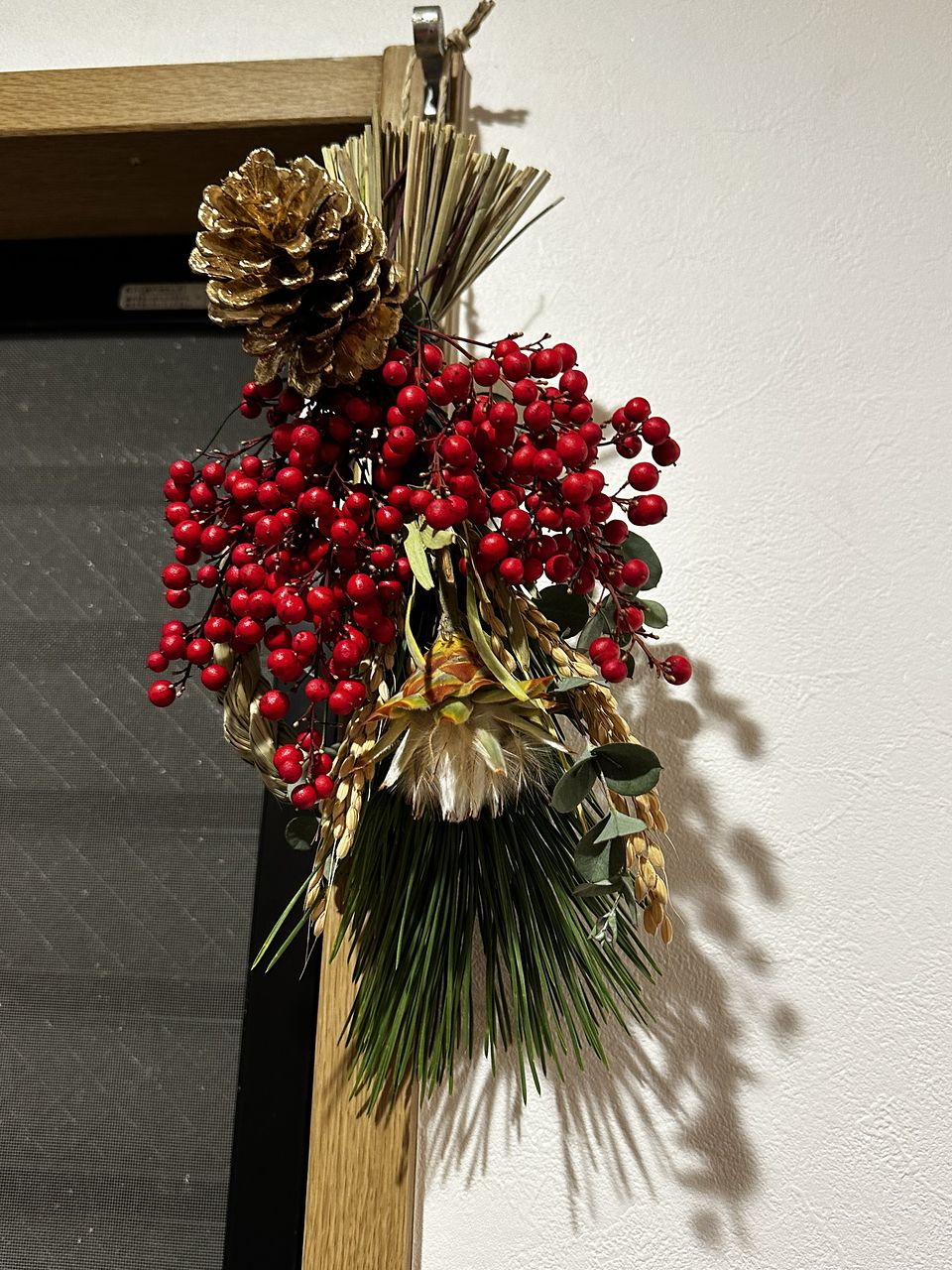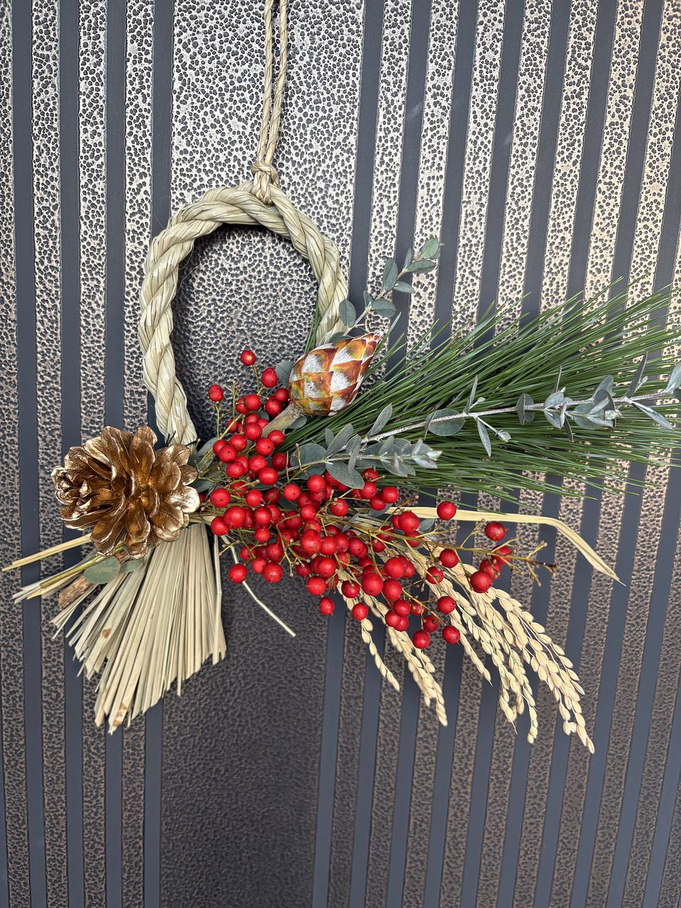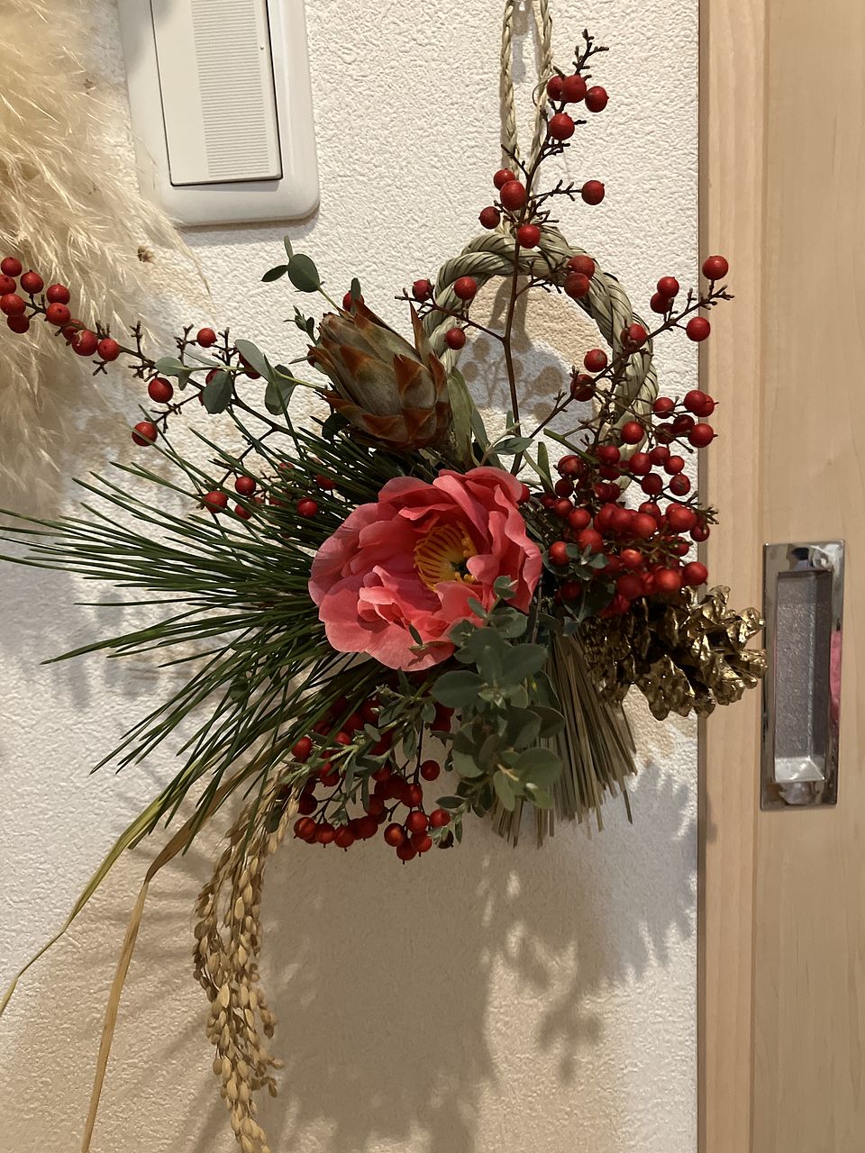 新鮮な花材で久しぶりに自由にアレンジ❣️ 楽しかった〜🎶 玄関ドアが大きめなのでダイナミックに😊 皆さまにとっても2026年、午年🐴が素敵な一年となりますように❣️