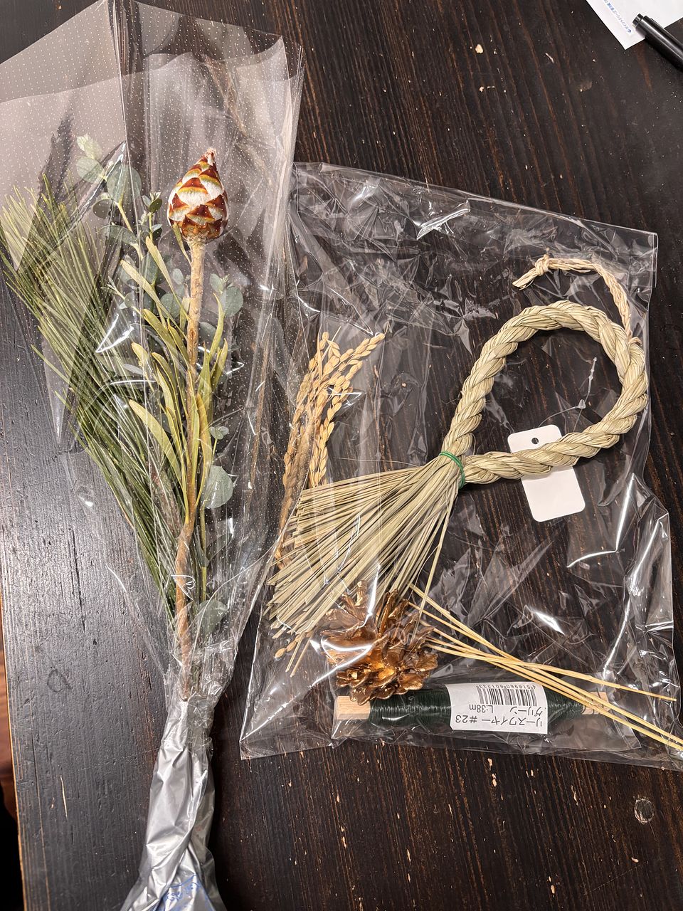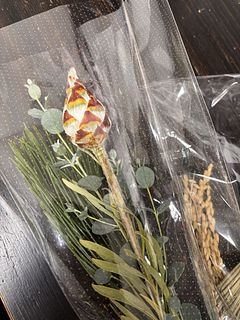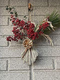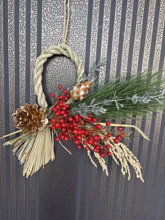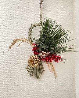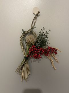 24日に到着。後日作成予定で南天が入っていなかったのに気付きませんでしたが、翌日には南天も無事届きました!内容はユーカリが少ない‥細々としたのが一本のみでしたので、上下で切り分けて使いました。 南天は届いた当初すでにかなりの落下+作成中もかなり身が落ちましたが、元々大きめだったので助かりました◯ キット花材のみだと少し寂しかったので、手持ちのお正月飾りも加えて、満足のいくお飾りが出来ました!