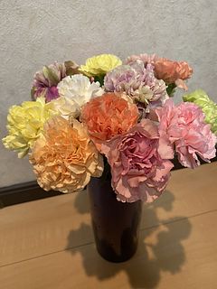 なかなかこれだけ色とりどりのカーネーションは揃えらないのでよかったです。特に今回はお安くかうことができました。我が家の玄関が明るくなりました