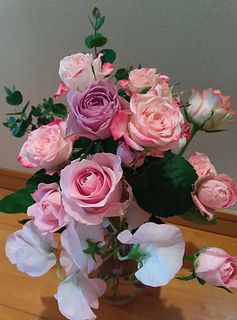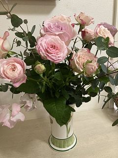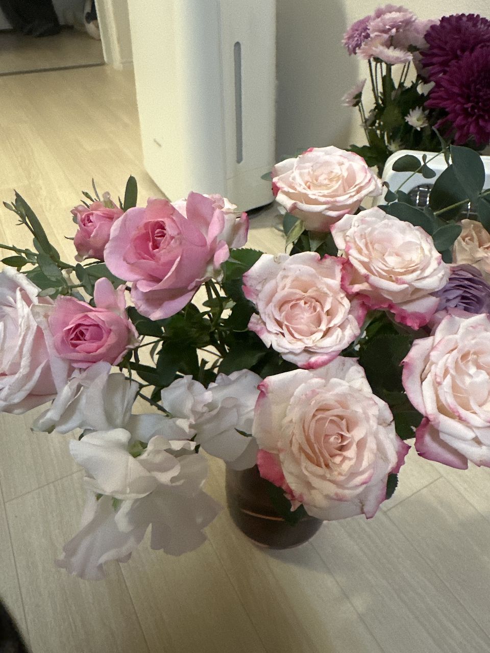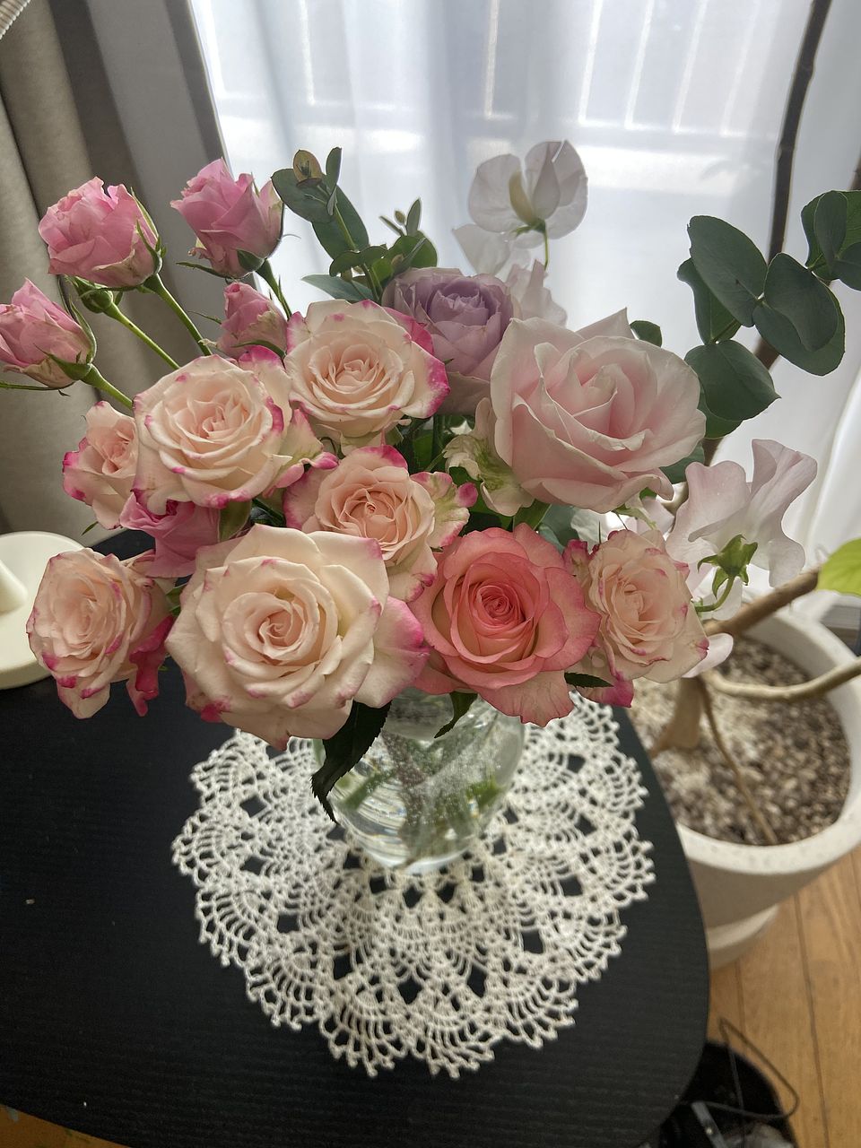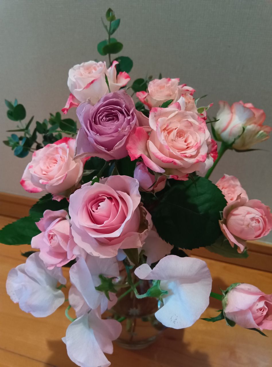多くの種類のローズが入ってました。私の好きなパープルのローズも2本入っていてとても嬉しかったです。この後どのくらい元気でいてくれるか楽しみです。日々の生活に花がある喜びを香りと共に過ごせそうです✨(ハランは庭から追加しています)