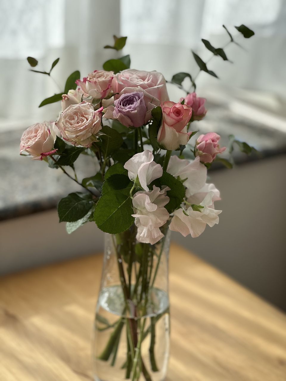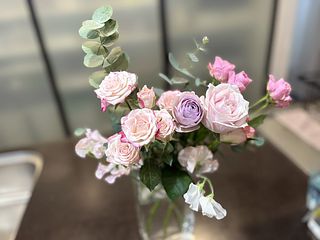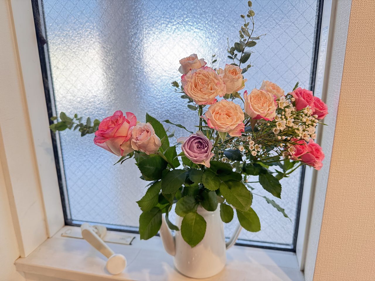 鮮度はバッチリでした👍🏻 内容は一輪バラ3本、複数輪バラ2本、スイートピー2本、ユーカリ2本でした。