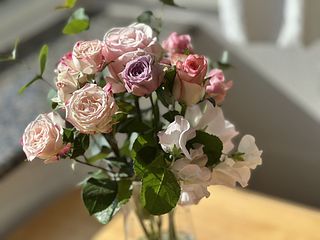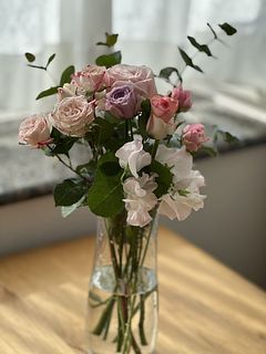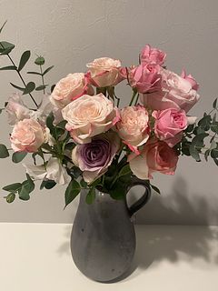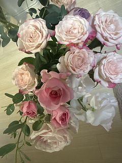 はじめて購入しました。届いて箱を開けると薔薇の良い香りがして、主にピンク色のバラ達が。一本薄い紫の薔薇もあり素敵でした。水に使ってしまう部分の葉っぱを取る作業をする作業も良いなぁと思いましたました。バタバタ忙しい毎日でしたが、花を楽しむホッとする時間ができました。これからも花や葉に触れて花を見てくつろぐ時間を楽しみたいです。Flowerさんありがとう😊