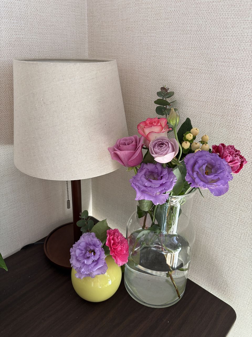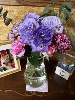 濃い紫のトルコキキョウとくすみピンクのバラが入っていて、写真よりボリュームや高級感があって良かったです。