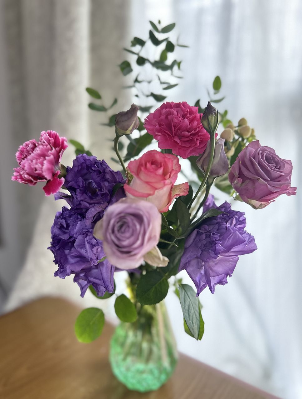 よく通販でお花を買いますが、今回このサイトからは初めて購入しました。季節のいろいろな組み合わせがお安く手に入るのが嬉しいです。そして、予想以上に新鮮なお花が届きました。大好きな色味に大好きなユーカリがグリーンとして入っていてリフレッシュかつリラックスできる香りです。すごく気に入りました。次に何を買うか楽しみです。