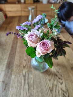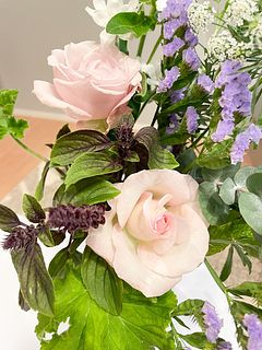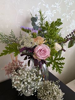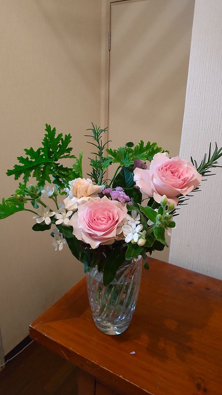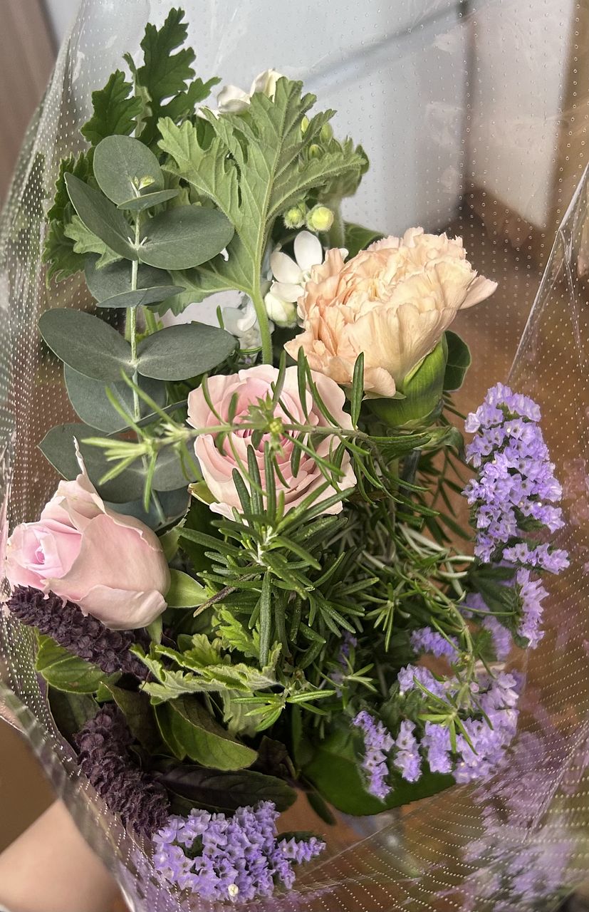▼届いたブーケのレシピ💐(推測):カーネーション/スターチス/レースフラワー/バラ/ホワイトスター/ユーカリ/ゼラニウム/ブプレリウム/バジル/ローズマリー/ミント
