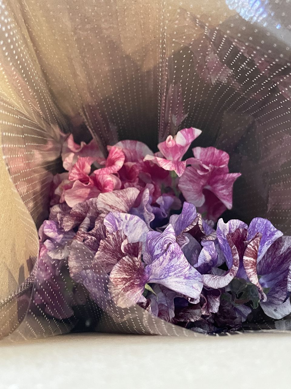 見た目もネーミングもかわいい💓スイートピー「恋かすみ」と「詩かすみ」をたっぷりと束ねました。フローリストのイチオシのスイートピーです🪸🍇