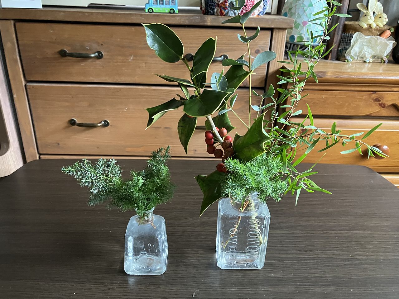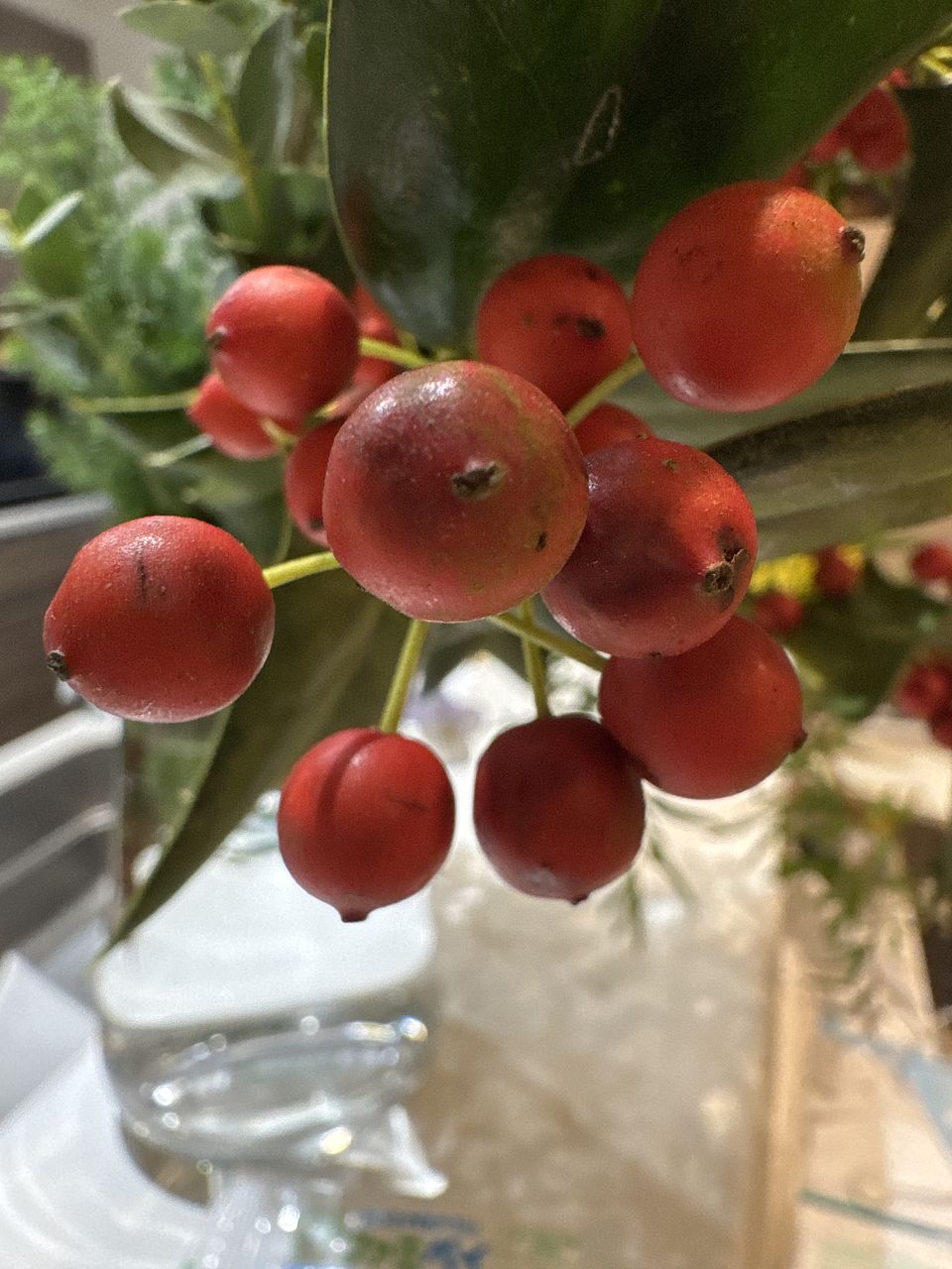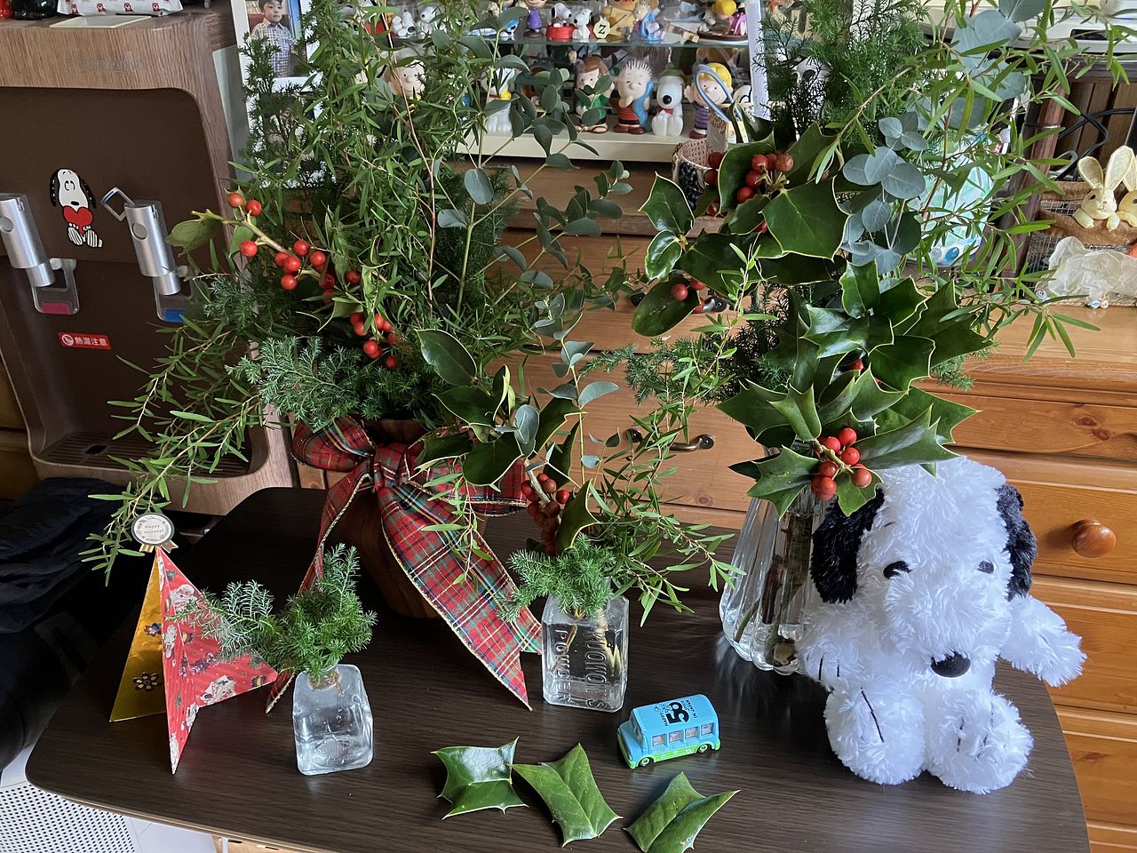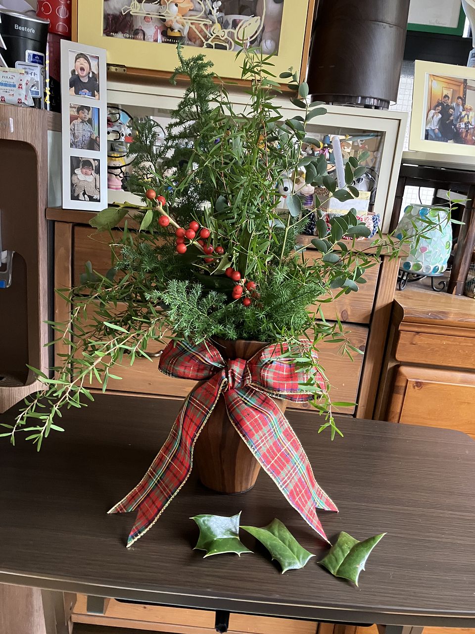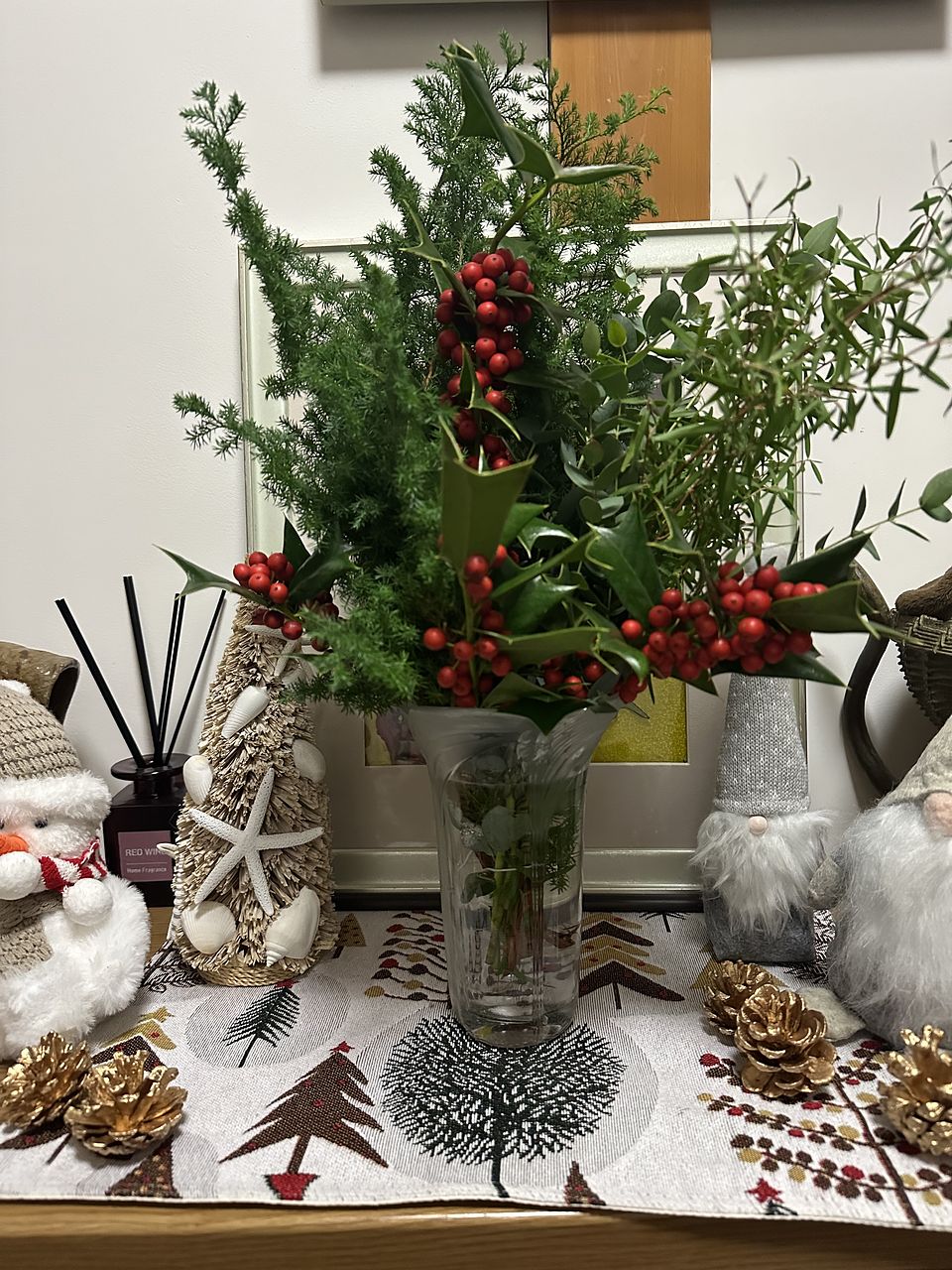 ボリュームはたっぷりでした♪ まずは生で楽しむため花瓶にいけてみました。ティーツリーの香りは思ったほど強くなかったです。ひいらぎはトゲトゲが結構痛くて大変ですがやはりポイントになる赤い実があると可愛いですね(^^)少し楽しんだらスワッグかリースに変身させてみようと思っています。