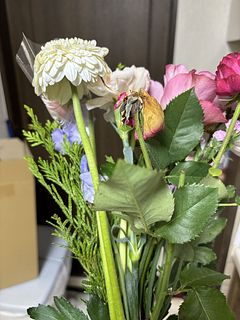 ブーケとあったのでそのまま飾れるのかと思ったのですが、色々なお花が混ざり込んでいたのでいくつかの花瓶に分けて飾ってみました。 お得感満載です🉐