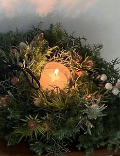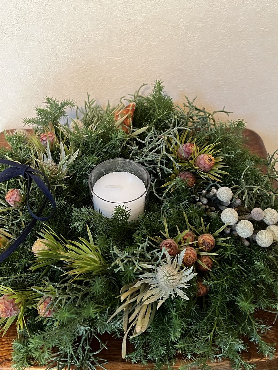 中央にはキャンドルを。火を灯せばやさしい光がリースのグリーンを照らして、まるで森の中の小さな灯りのよう🕯️🧚