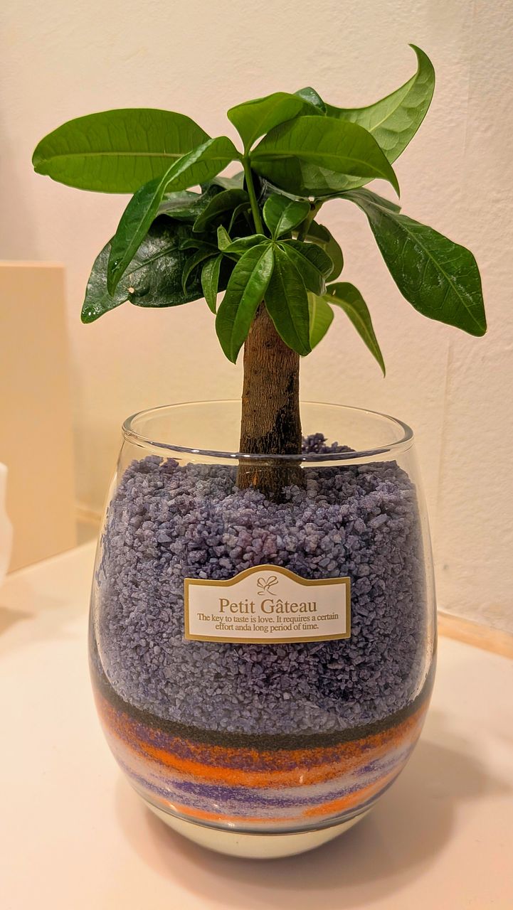 夕暮れの空をイメージした、サンセットカラーのカラーサンドに植えられたパキラ🌴