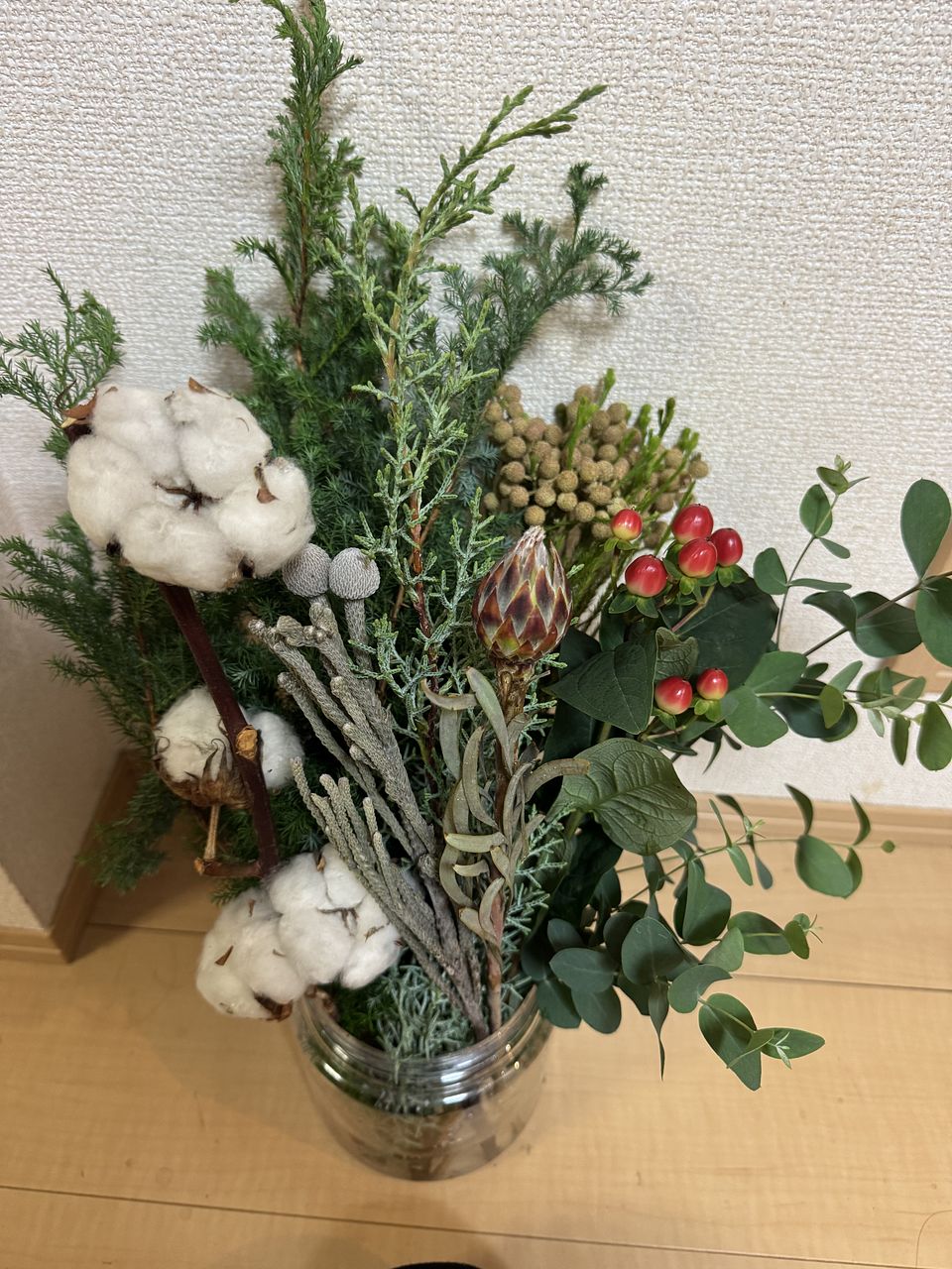 楽しみに待っていたので本当に嬉しいです ヒムロスギのボリュームがたっぷりでした!ヒペリカムの赤い実が可愛くてブルーアイスとユーカリが入っていたのも良かったです 数日飾ってスワッグにしたいと思います