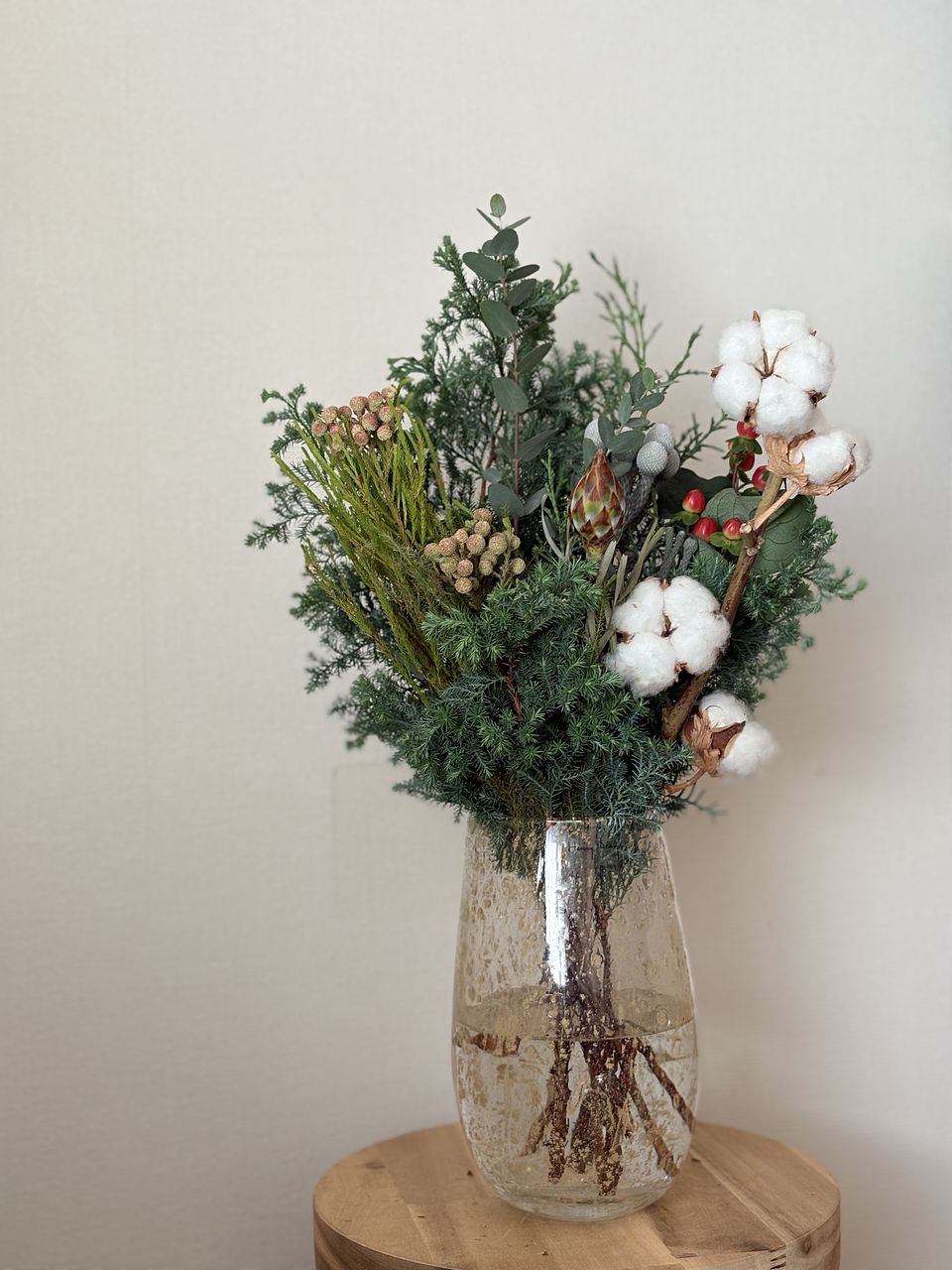 いい香りに包まれました! かわいい花束には、ユーカリ、針葉樹、綿花、赤い実などの様々な植物でボリュームたっぷりで、クリスマスのアレンジが楽しみです!