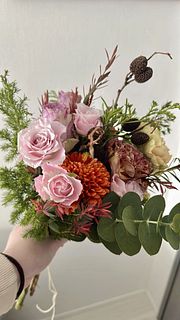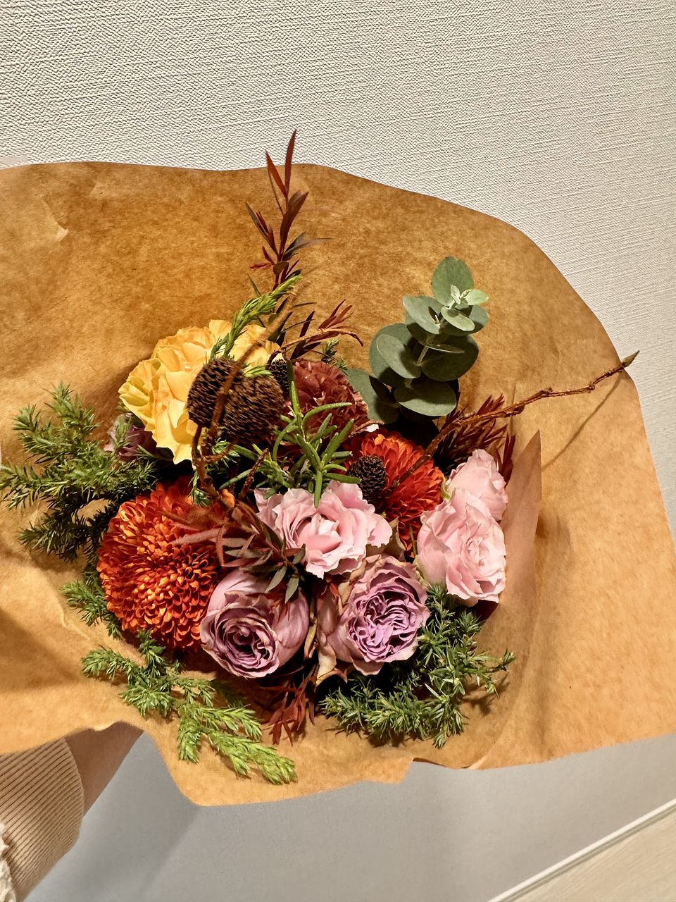 やっと念願のayaさんのブーケを購入でき嬉しい!グリーンの使い方がとても素敵。丸い葉のユーカリなど、普段見る事があまりない花材の組み合わせが素敵。だけど、タイミング的にクールの配送じゃなくなって、心配してたら案の定、まる2日かかりで届いたお花は、小さなお花はパラパラと落ちて、少しカラカラ気味、トルコキキョウや、カーネーション?のピンクのお花は全て薄茶に変色してしまっていました。配送中の、2日間は30度に近い気温だったので、残念でした。なので、こちらの評価になりました。本格的に涼しくなったら、またお願いしたいと思います。