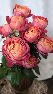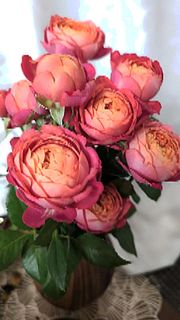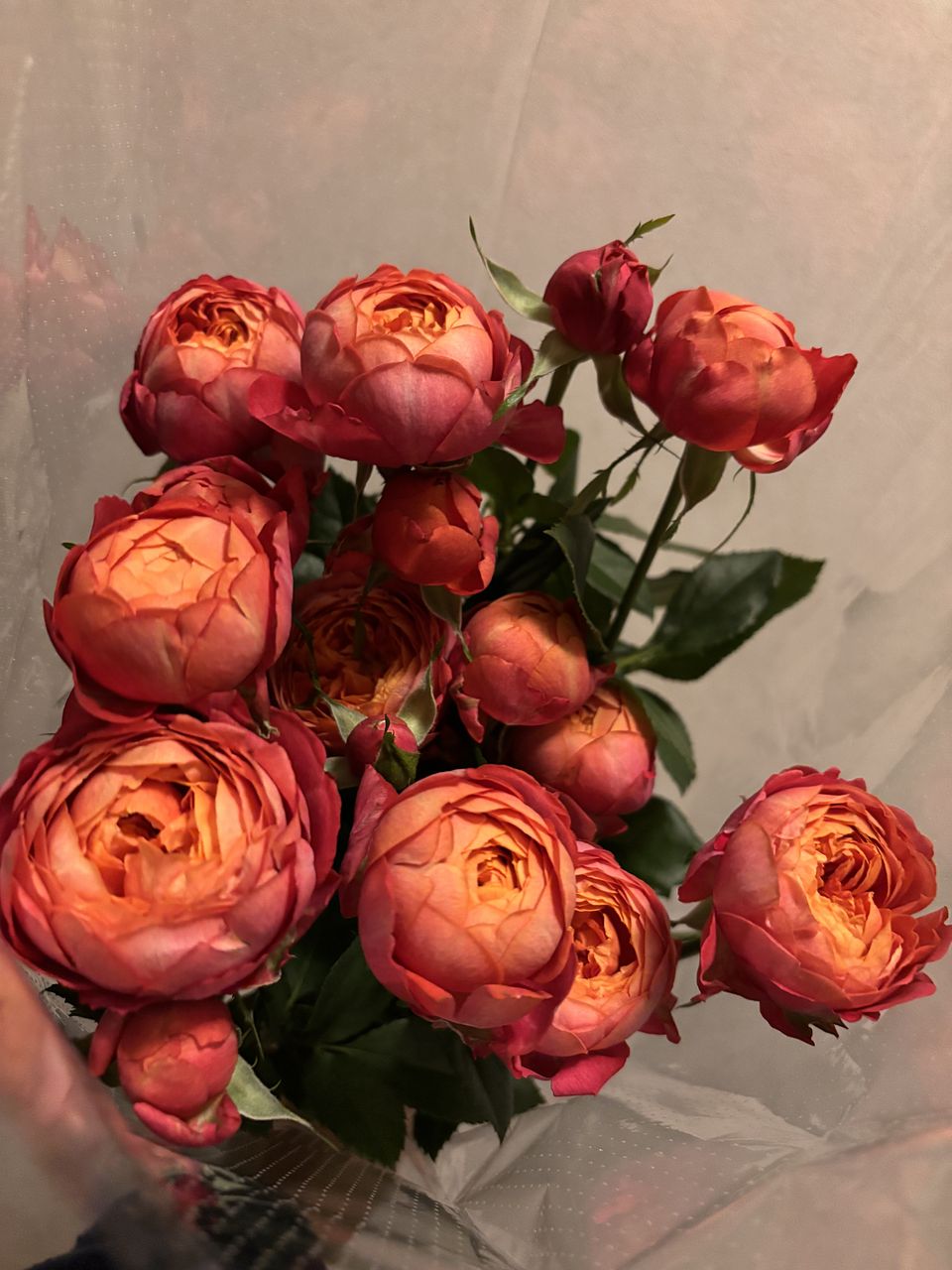 なんとも言えないオレンジと赤のうつくしいお色。愛らしくて、それでいて、こんなに大きいのに、スプレーバラなんて、見事です。希少な薔薇を拝見できて、食卓にかざらせていただきました。