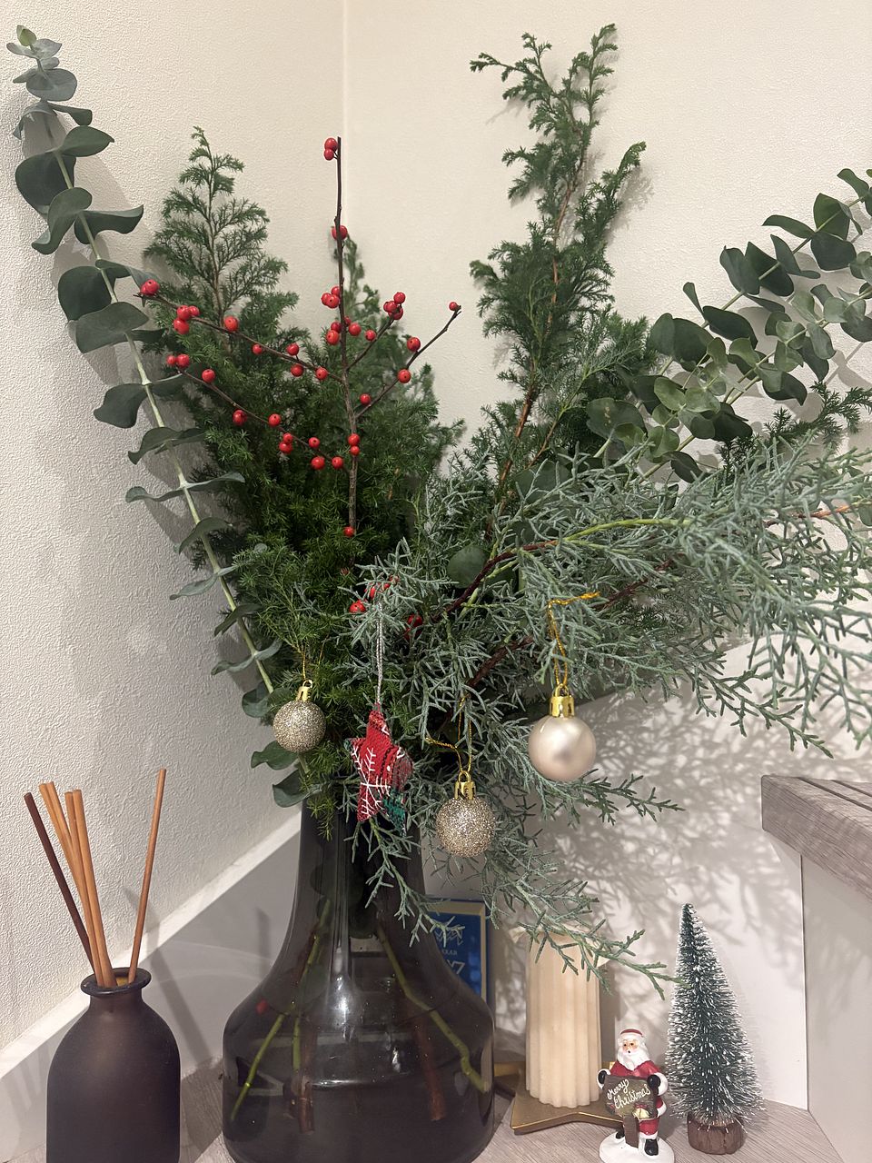 今回セレクトした枝物は、赤い実がかわいい「ウィンターベリー」、ロングサイズの「ひむろ杉」「ブルーアイス」「ユーカリ」と盛りだくさん🌲クリスマスオーナメントを吊るせばお部屋が一気にホリデームードに✨🎁