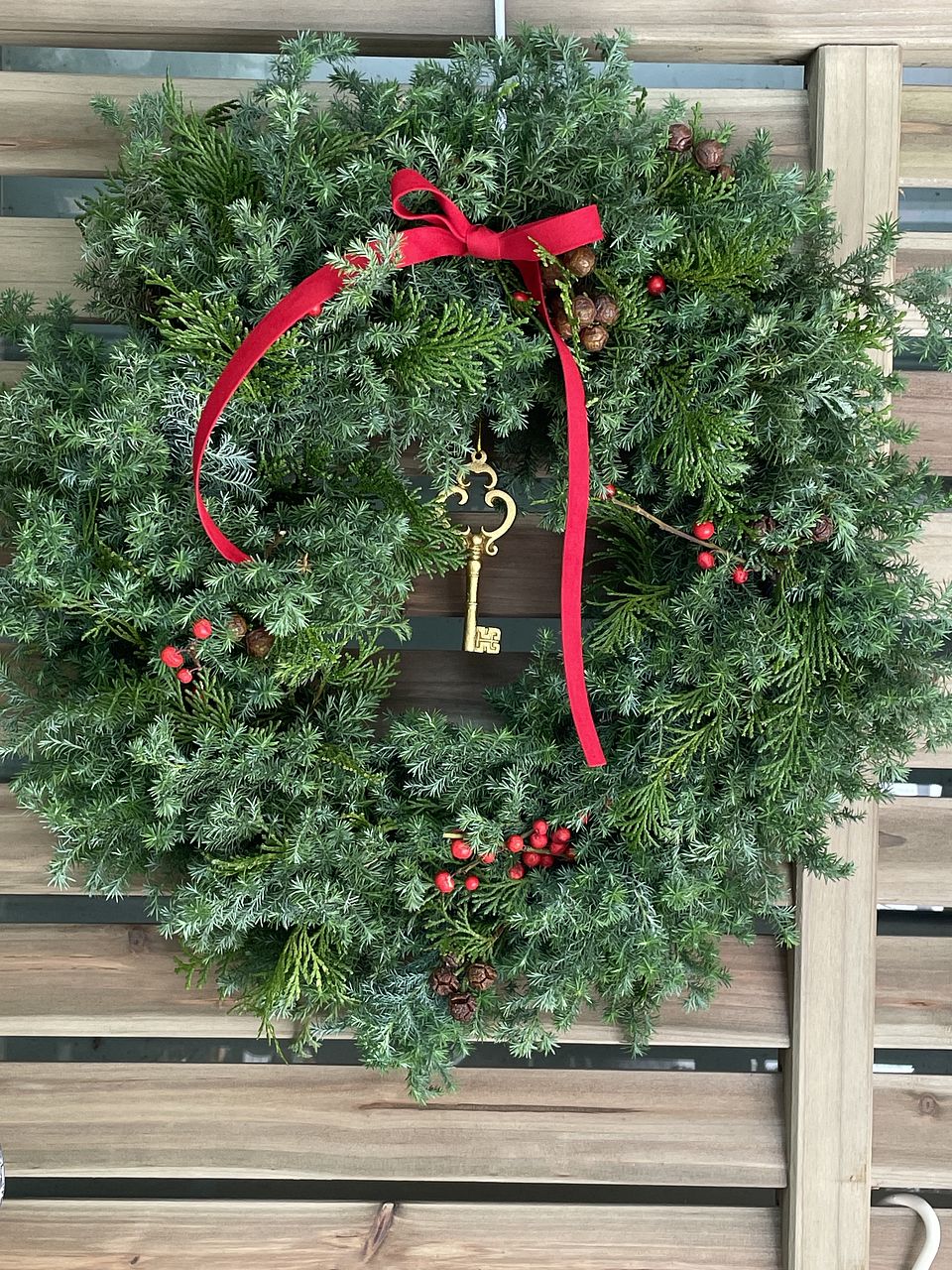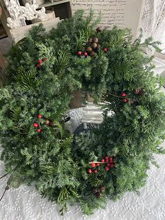 リースを作りたくて注文しました グリーンの香りに癒されなが仕上げました 可愛いウインターベリーがアクセント 届いた花材だけでたっぷりふわふわの30センチリースが仕上がりました アクセントにリボンもつけました