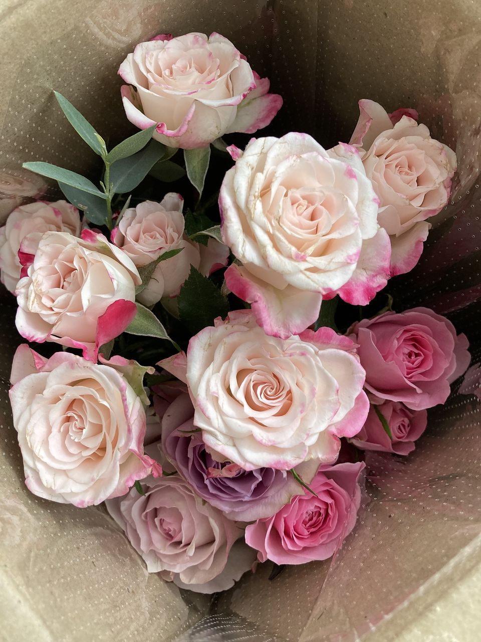 はじめて購入しました。届いて箱を開けると薔薇の良い香りがして、主にピンク色のバラ達が。一本薄い紫の薔薇もあり素敵でした。水に使ってしまう部分の葉っぱを取る作業をする作業も良いなぁと思いましたました。バタバタ忙しい毎日でしたが、花を楽しむホッとする時間ができました。これからも花や葉に触れて花を見てくつろぐ時間を楽しみたいです。Flowerさんありがとう😊
