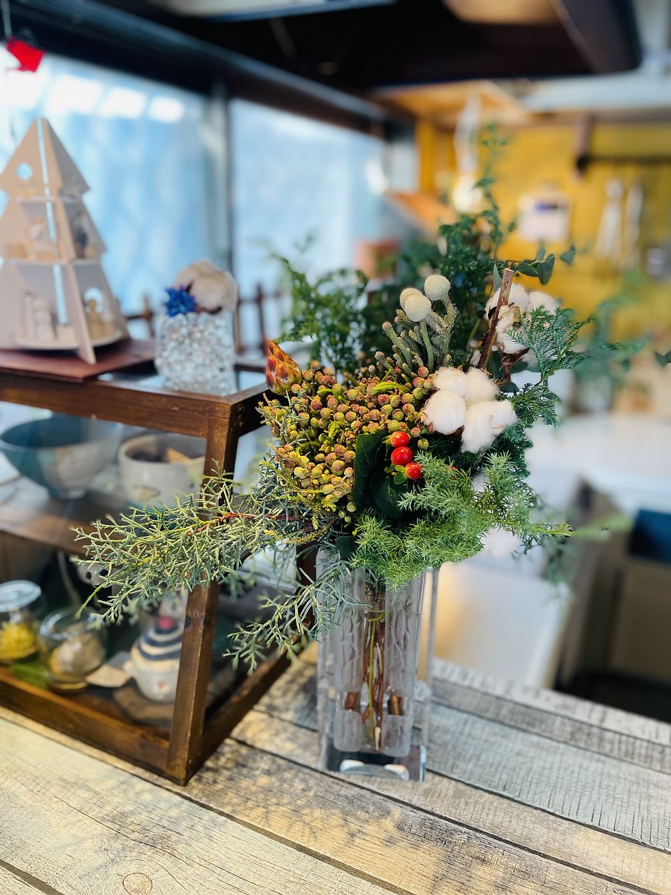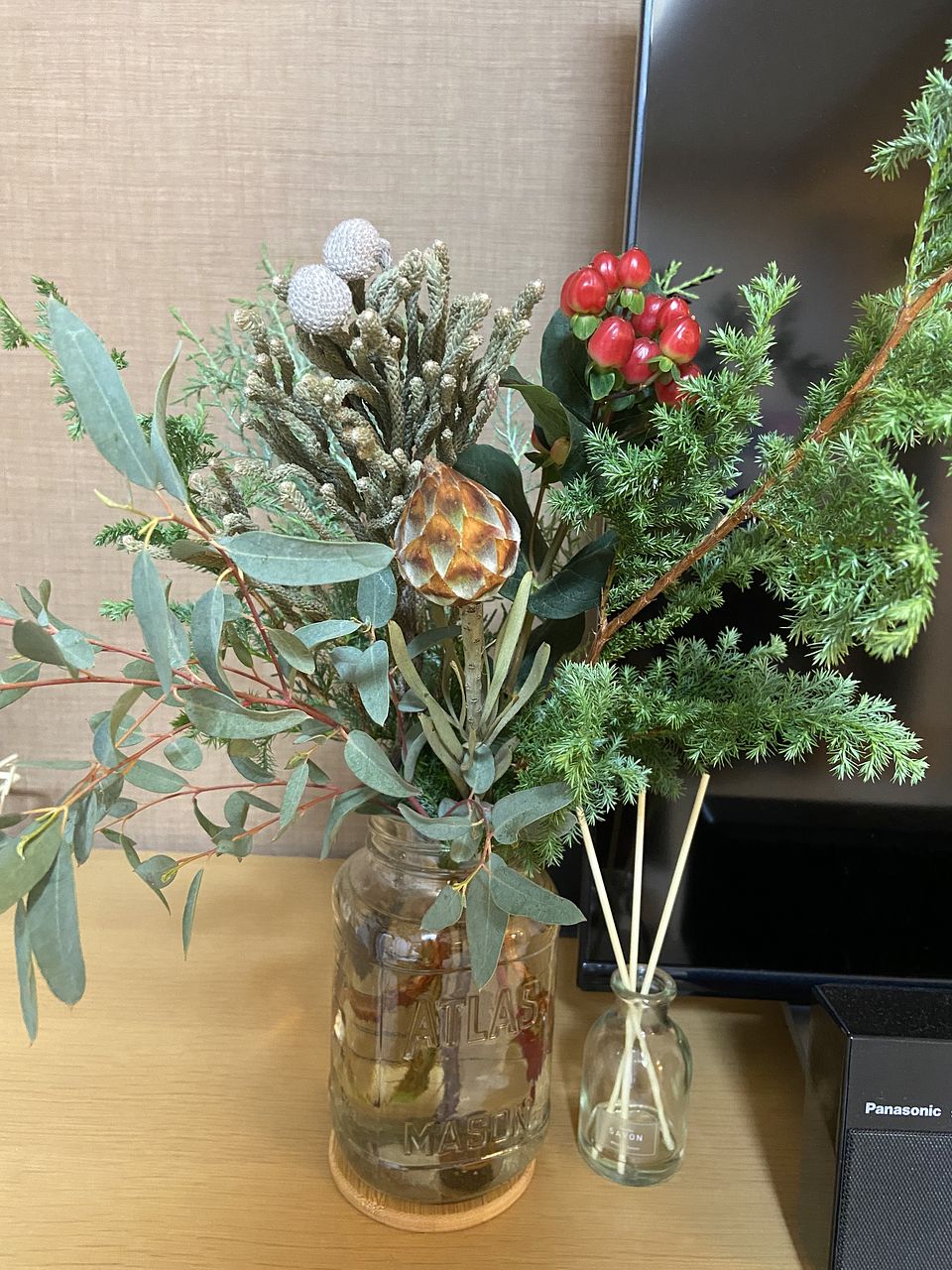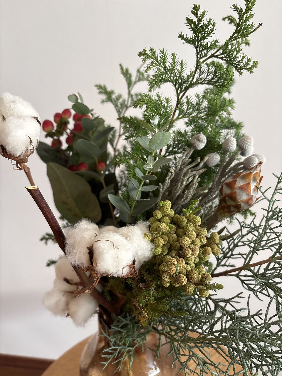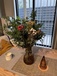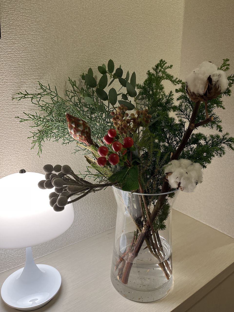 とっても素敵すぎました♡ 赤の花器でクリスマスらしく。 ボリュームもさながら、種類もたくさんでテンションが上がります!値段がお手頃すぎる! 取った下葉は捨てるのがもったいなかったので、小さめの花器に生けてミニツリーにして洗面所に飾りました。 来年もあったらまた必ず注文させていただきたいです。