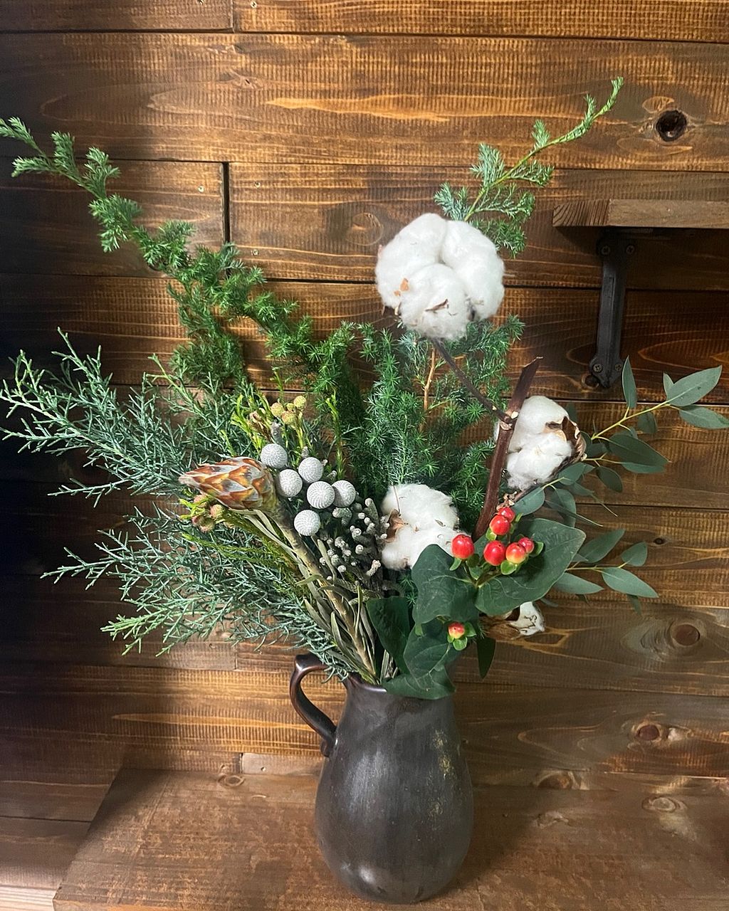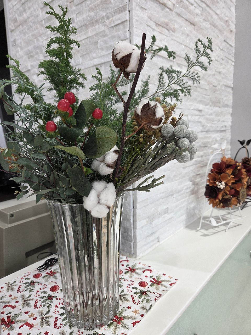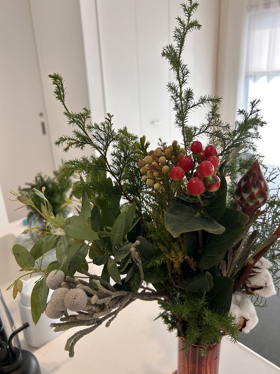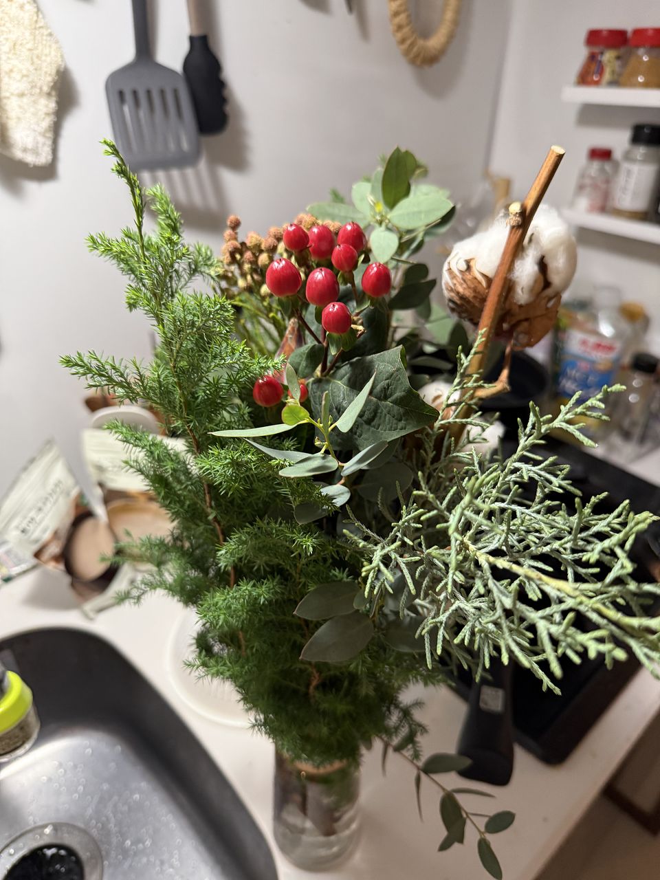 とっても素敵すぎました♡ 赤の花器でクリスマスらしく。 ボリュームもさながら、種類もたくさんでテンションが上がります!値段がお手頃すぎる! 取った下葉は捨てるのがもったいなかったので、小さめの花器に生けてミニツリーにして洗面所に飾りました。 来年もあったらまた必ず注文させていただきたいです。
