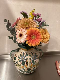 マムの花びらが一部残念な状態、薔薇も1本元気がありませんでした。グリーンもちょっとカリカリに茶色くなっているところが多くて😢 お花もグリーンも組み合わせは素敵と思うのですが、色合いが、私的にはイマイチでした。次回に期待します。 このフラワーベースとてもいいと思います。