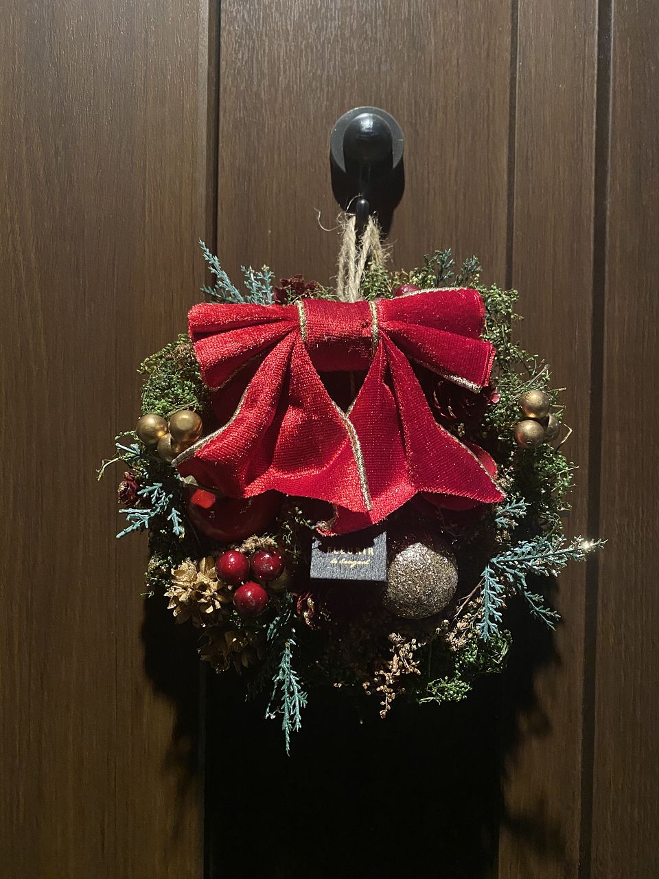 かわいいリースでした。商品名通り小さいリースで、玄関に飾りましたがうちの玄関には小さ過ぎたかな?と。でも、キラキラして赤いリボンがとても素敵です。
