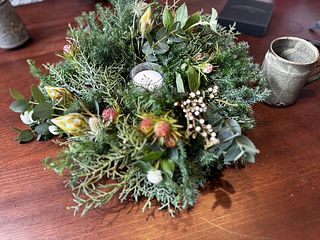 中央にはキャンドルを。火を灯せばやさしい光がリースのグリーンを照らして、まるで森の中の小さな灯りのよう🕯️🧚
