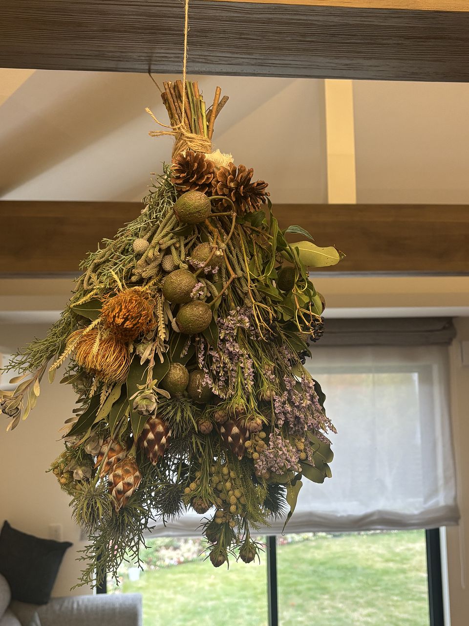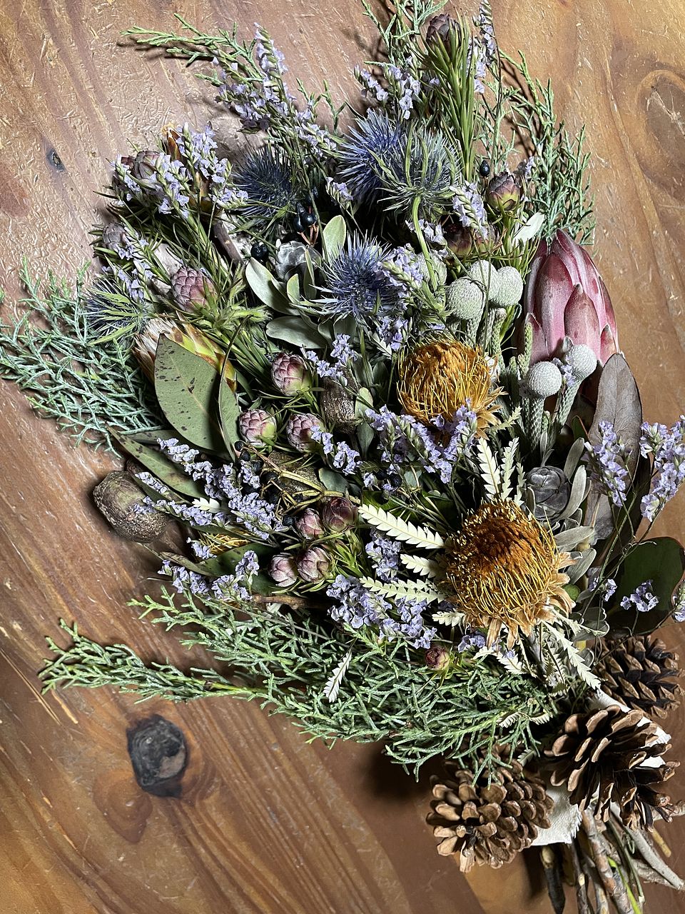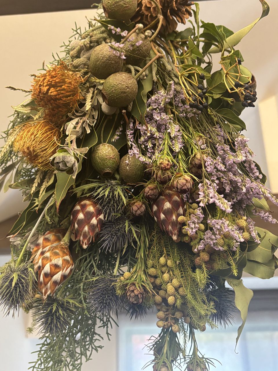 贅沢なホリデースワッグ!! とってもボリュームあり、ブルーアイスの香り、エリンジウム、スターチスなどたくさん冬の実が詰まっていて、きゃーかわいい🩷と呟いてしまいました🥰 上を見上げるとずっしりとした💐がとても素敵で気分もホリデーシーズン‼️