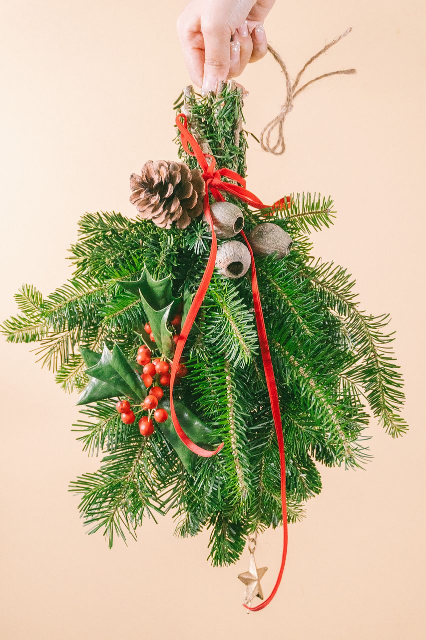 モミのグリーンに、クリスマスホーリーの赤い実を添えたシンプルで飾りやすいスワッグ🌲