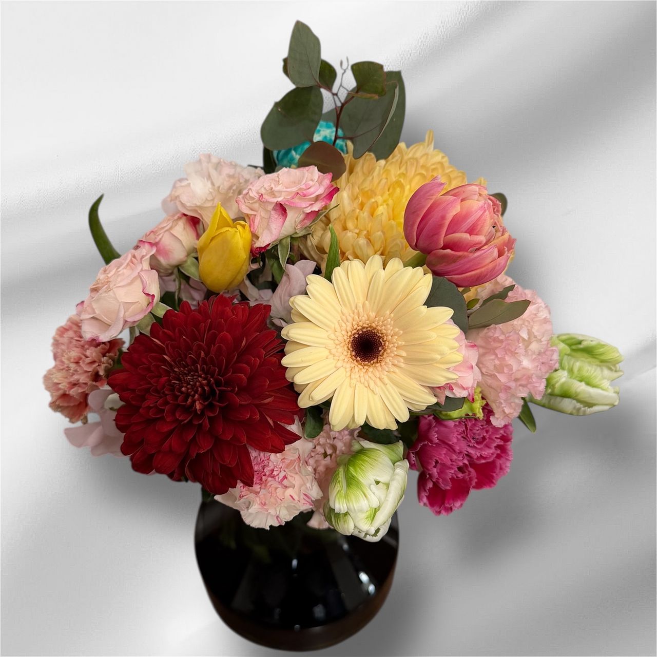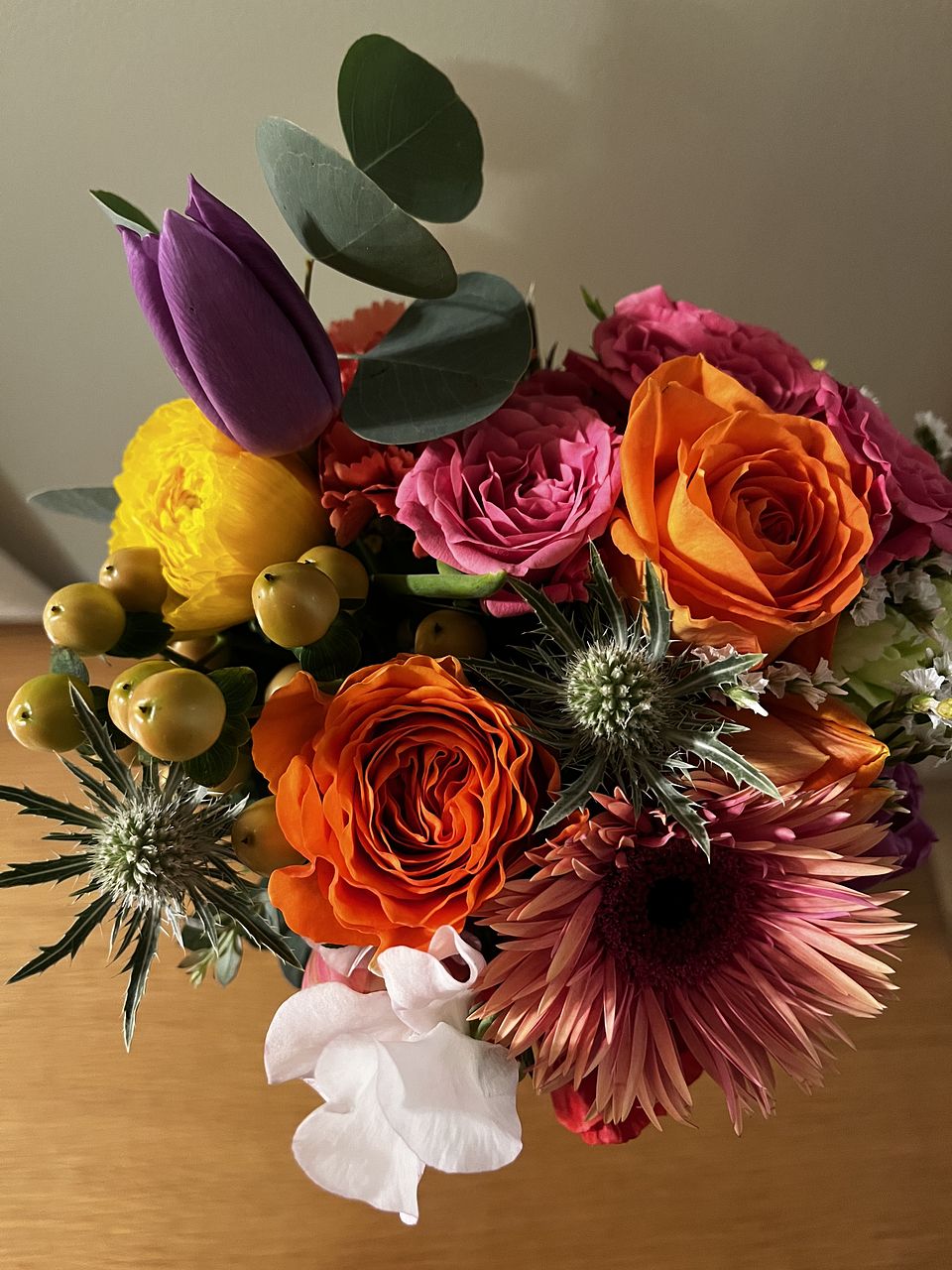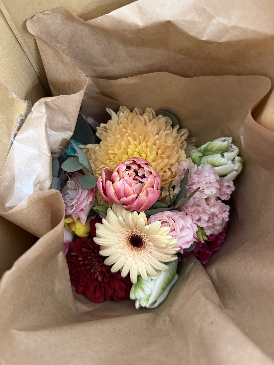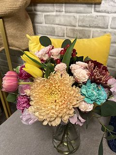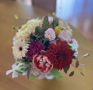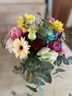 チューリップの他にガーベラなど お花がたくさん入っていて とても華やかでした。 フラワーベースから溢れ出しそうなブーケ✨ お部屋がパッと明るくなりました💖 ありがとうございました。
